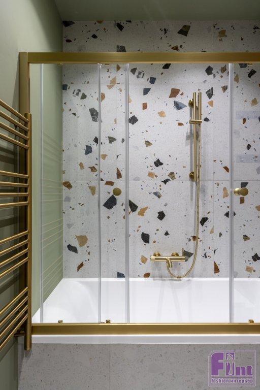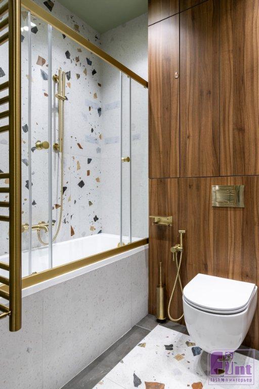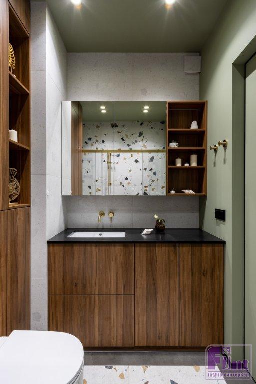 Для пола в кухне-гостиной, спальне и на лоджии выбрали кварцвиниловое покрытие «ёлочкой», имитирующее паркет. В прихожей — крупноформатный керамогранит с рисунком терраццо. Тот же керамогранит уложили на пол и стену в ванной комнате. Его скомбинировали с нейтральным светлым керамогранитом и краской фисташкового цвета. В зоне инсталляции стены оформили мебельными панелями цвета тёмного ореха. В этом же цвете спроектирована мебель в санузле и в прихожей.