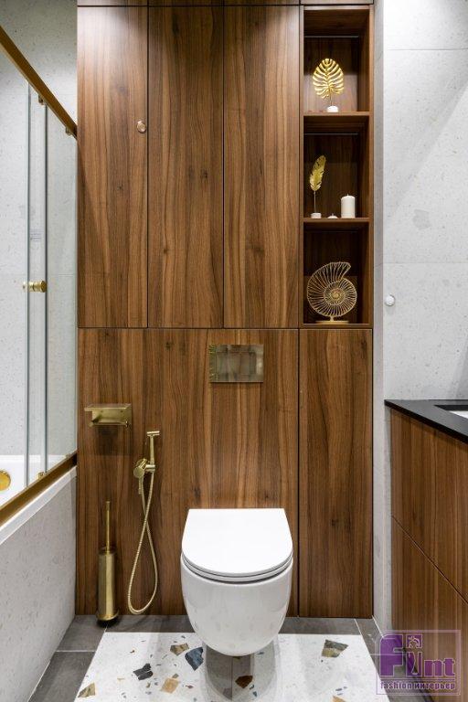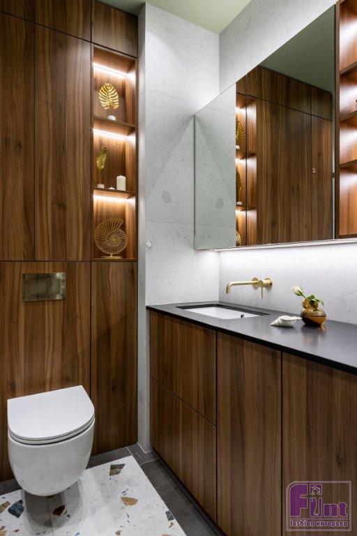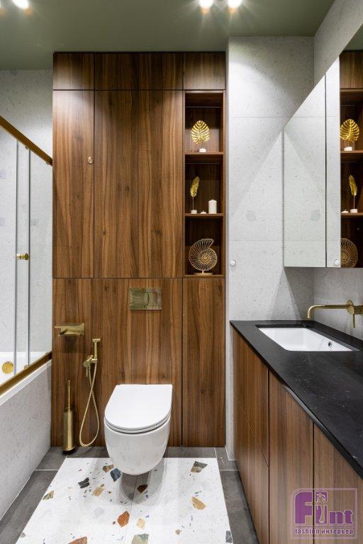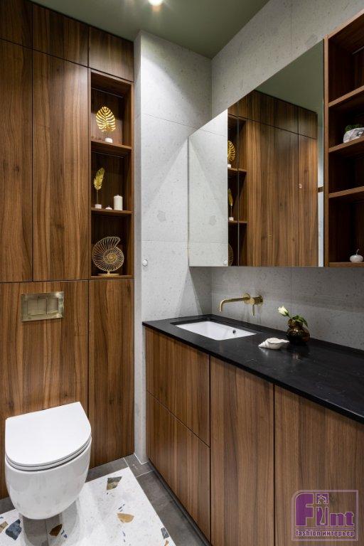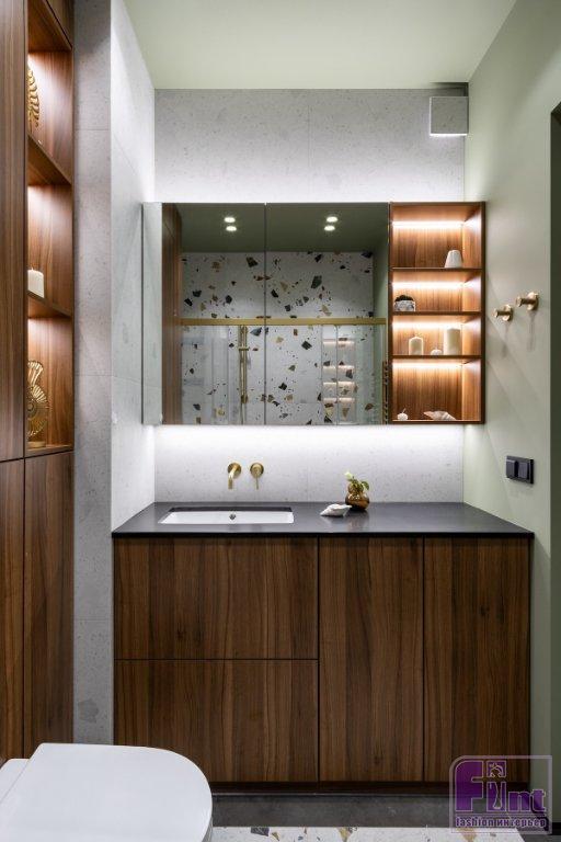 В ванной комнате — вместительная тумба под раковину, где спрятана и стиральная машина. Над раковиной — подвесные шкафчики с зеркальными фасадами, где тоже можно хранить разные мелочи. Над инсталляцией унитаза спрятаны коммуникации, но также есть полки для хранения.