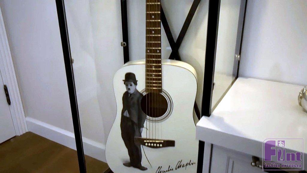 В центре комнаты стоит небольшой журнальный столик. На потолке — чёрная кованая люстра без плафонов с лампочками, имитирующими восковые свечи. Гостиная освещается также точечными потолочными светильниками из металла, окрашенного в белый цвет. На стене висит большой плазменный телевизор в белом корпусе. Внизу — комод такого же оттенка, в котором хранятся полезные мелочи. Двери из натурального дерева дополнены немецким уплотнителем, поэтому обеспечивают отличную звукоизоляцию. Пластиковые розетки и выключатели выдержаны в винтажном стиле.