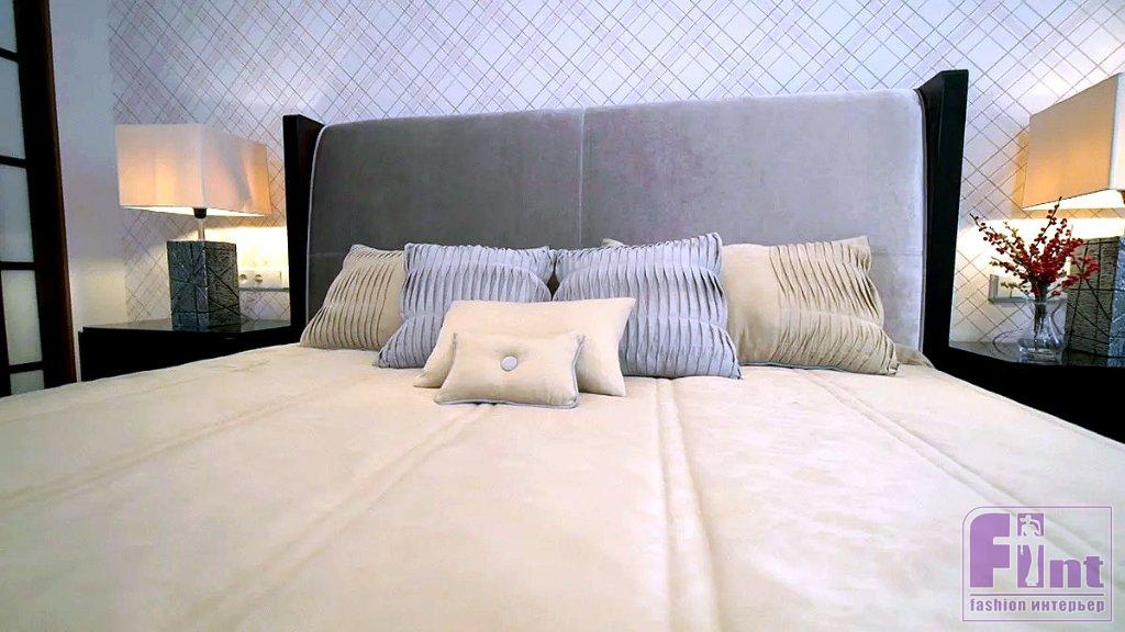 В спальной зоне стоит большая двуспальная кровать с мягким изголовьем. Высокий ортопедический матрас с независимым пружинным блоком позволяет супругам качественно отдыхать после тяжёлого трудового дня. По обеим сторонам расположены прикроватные тумбочки, шпонированные вишней, на которых установлены настольные светильники с абажурами, выполненными из натуральной ткани.