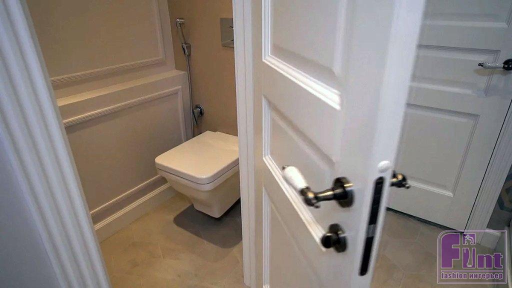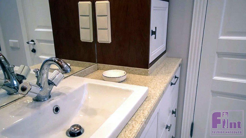 Помещение для принятия водных процедур практически полностью выдержало в белом цвете. Столешница светлого оттенка изготовлена из искусственного камня. Белоснежная раковина прекрасно вписывается в общую стилистику ванной комнаты. Главное достоинство помещения — множество шкафчиков для хранения, которые занимают пространство от пола до потолка. Вместо ванной хозяева остановились на душевой кабине немецкого производства. Прозрачные стеклянные дверцы имеют специальное водоотталкивающее покрытие. Встроенные смесители занимают очень мало места. Электрический полотенцесушитель регулируется вручную и при необходимости автоматически отключается.