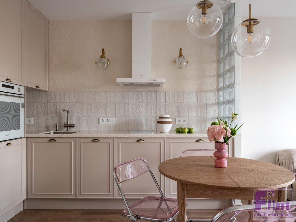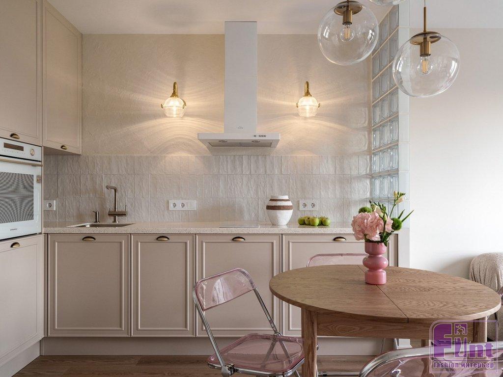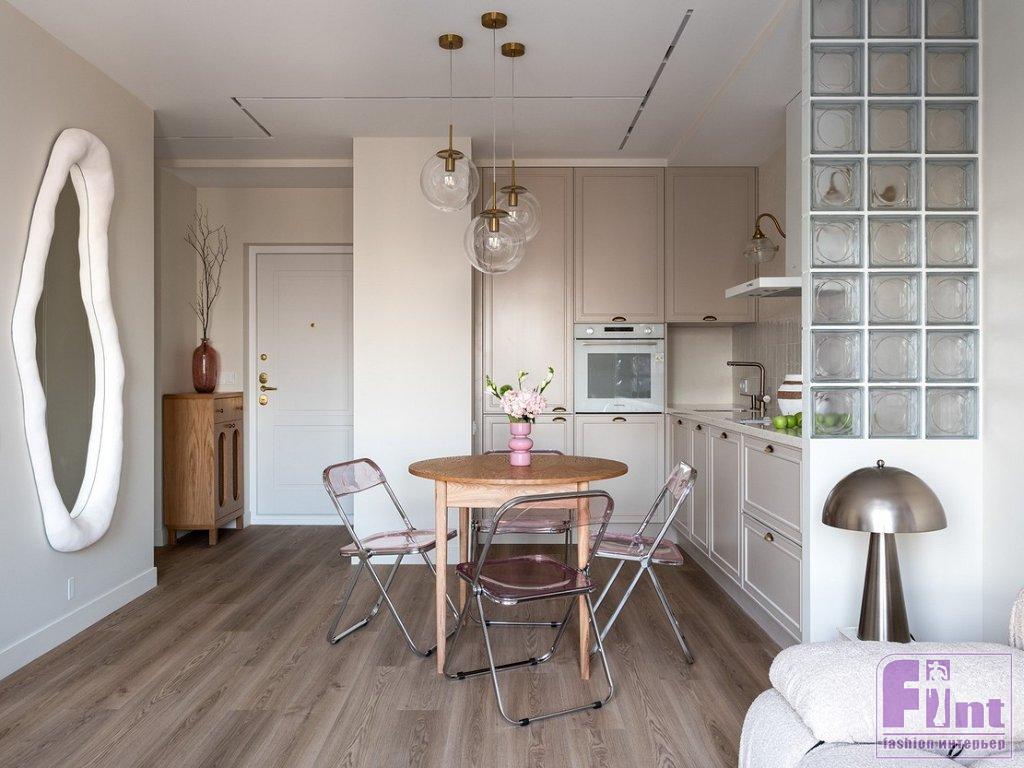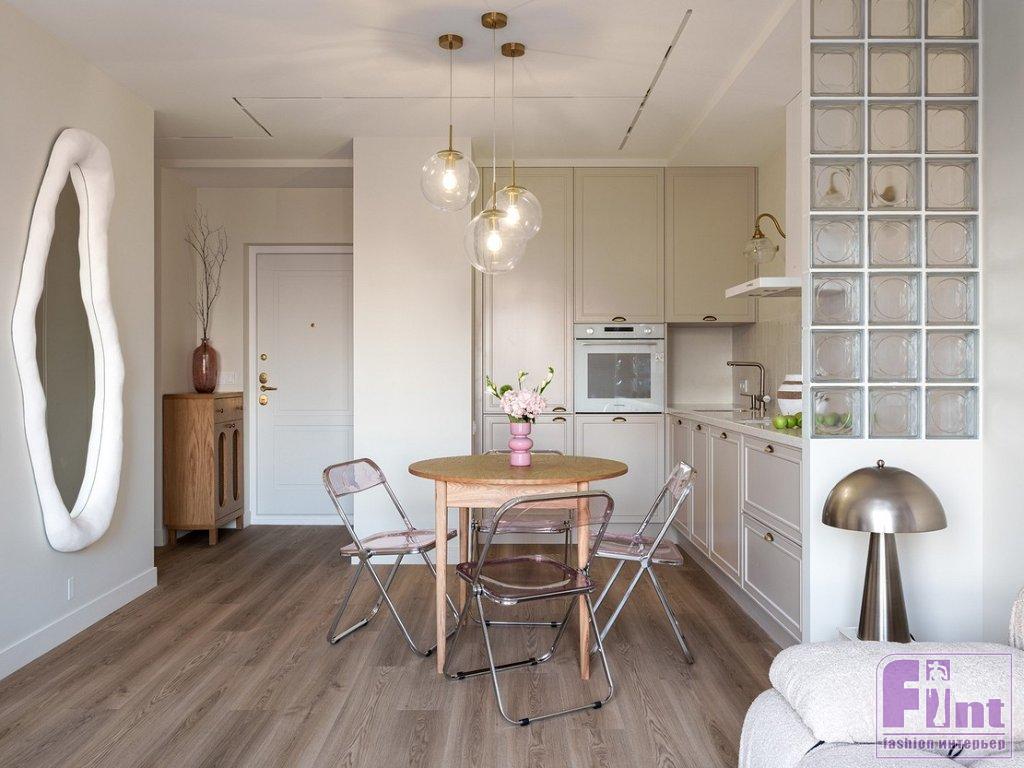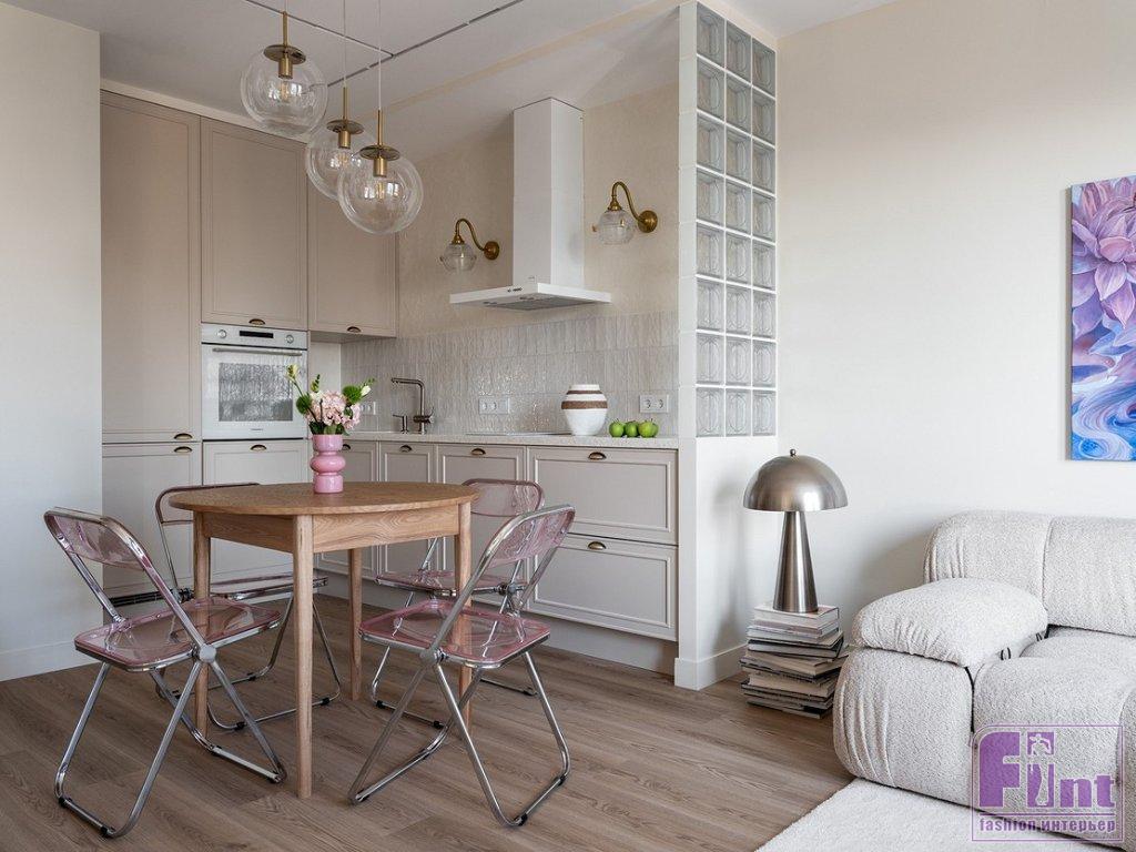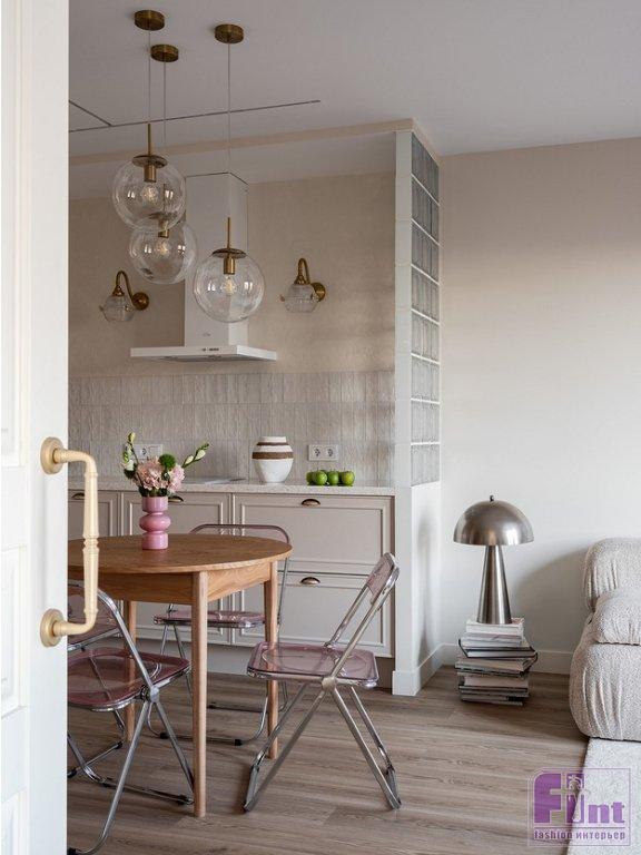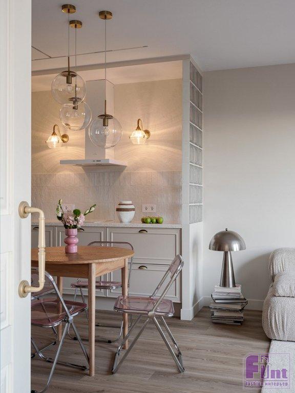 «Использовать стеклоблоки в дизайне квартиры меня попросила хозяйка — ей нравится этот материал. Я решила использовать их «умение» прятать предметы, разграничивать зоны, но при этом пропускать свет. То есть, сидя на диване, хозяйка не видит кухонных шкафов справа от неё — они за перегородкой. Важно помнить, что со стеклоблоками не надо перебарщивать, они достаточно активны в декоративном плане и могут придать помещению индустриальную тональность, а это не всегда нужно. В данном случае стиль интерьера — эклектика, в которой присутствуют разные составляющие, но все очень сбалансировано. Тему прозрачности я подчеркнула с помощью стеклянных плафонов потолочных светильников и бра, а также с помощью складных стульев из нежно-розового поликарбоната. Но чтобы интерьер не выглядел слишком холодным, я добавила стол и кресло из натурального дерева, матовые окрашенные поверхности, а также тактильно приятные обивки и шелковистый ковёр с высоким ворсом», — рассказала о проекте Ольга.