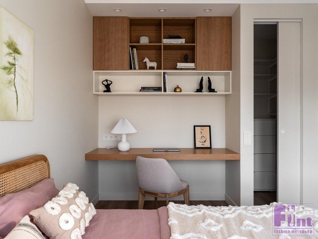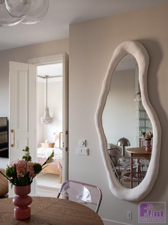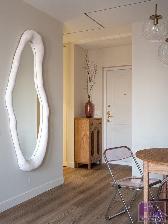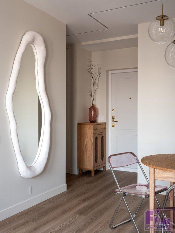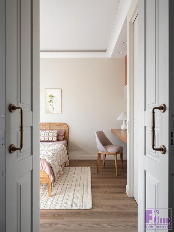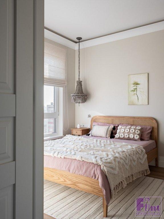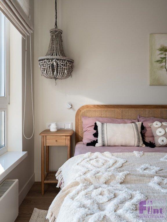 В спальне дизайнер хотела, как она сама признается, создать немного «балийское» настроение. Отсюда изголовье кровати из плетёной соломки в деревянной раме, люстра-монгольфьер с фактурными деревянными подвесками вместо традиционных хрустальных, покрывало и подушки с этническими узорами. Зеркало в прихожей изготовлено на заказ, рама выполнена из массы на основе целлюлозы и полимеров, сверху отштукатурена, отшлифована и окрашена.
