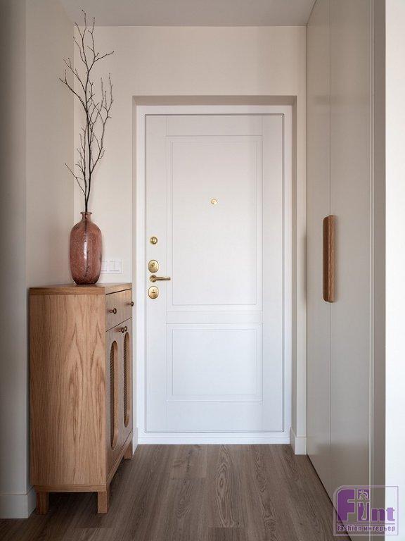 Квартиру хозяева купили с ремонтом от застройщика. По просьбе заказчиков дизайнер поменяла планировочное решение, сохранив при этом то, что трогать нельзя: несущую стену между спальней и гостиной, кухню и мокрые зоны. Входная дверь располагалась раньше прямо напротив входа в спальню. Дизайнер сделала новый дверной проем со стороны гостиной — распашные двери, по 40 см каждая створка, не утяжеляют пространство. Двери высокие — 2,30 см. Это придает статусности интерьеру и, кроме того, визуально приподнимает потолок.