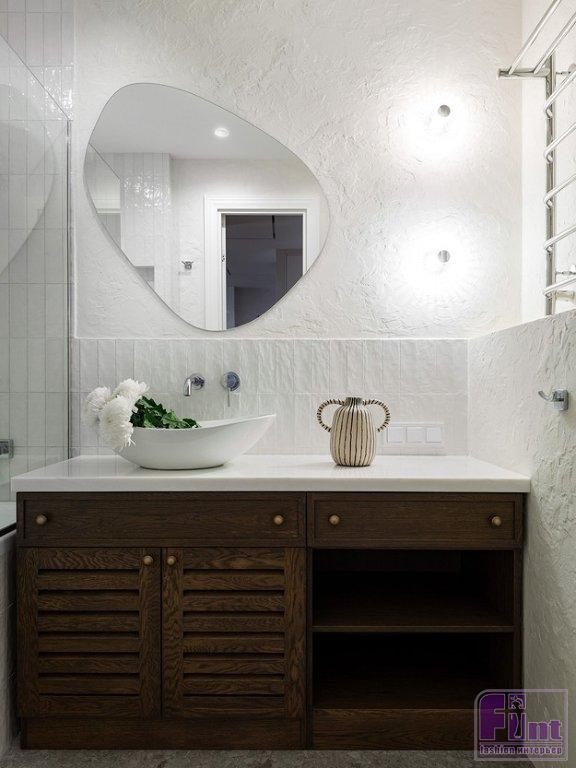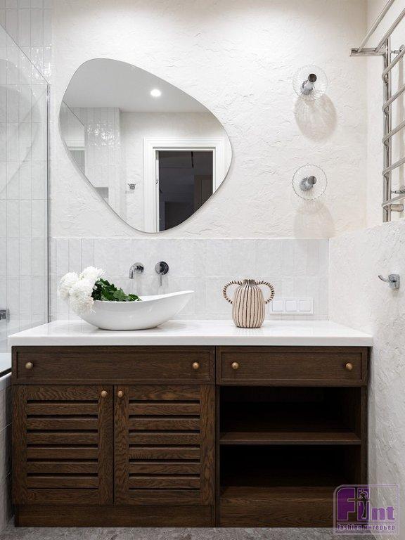 С пола сняли ламинат и постелили кварцвинил — прочный современный материал. Новые перегородки возвели из ГКЛ, целиком поменяли электрику. Подвесной потолок демонтировали и сделали новый из гипсокартона, сохранив прежнюю высоту помещений (2,57 см). Гипсокартон зашпаклевали и отделали матовой износостойкой краской. В ванной комнате использовали краску, декоративное покрытие под природный камень, керамическую плитку, на полу — керамогранит. Кухонный гарнитур на производстве выкрасили в оттенок стен по палитре NCS.