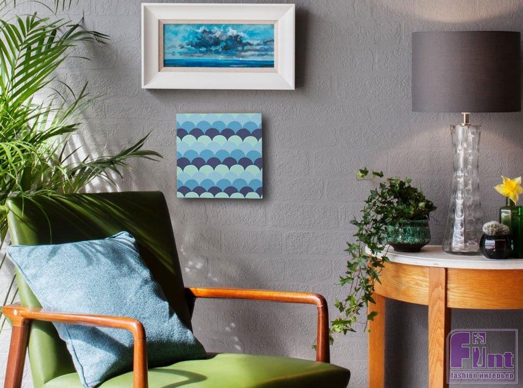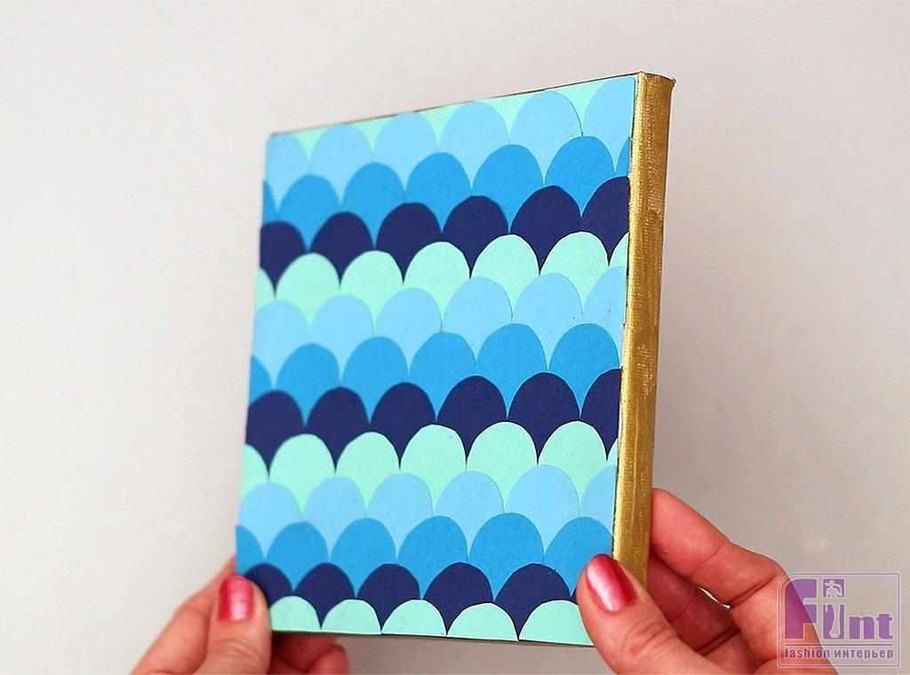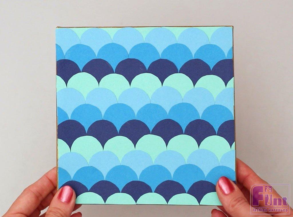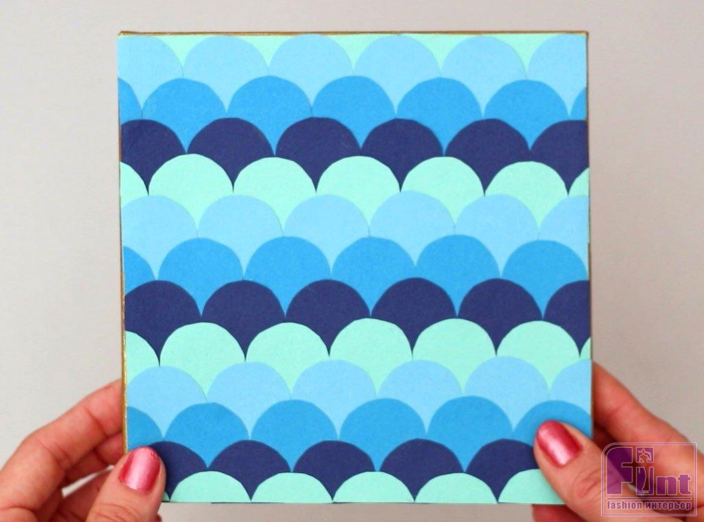 Готово! Ваше яркое панно с орнаментом «рыбья чешуя», сделанное своими руками, выглядит просто потрясающе! Орнамент, напоминающий чешую рыбы, в оттенках морской воды смотрится прекрасно и создаёт красивый акцент в интерьере.