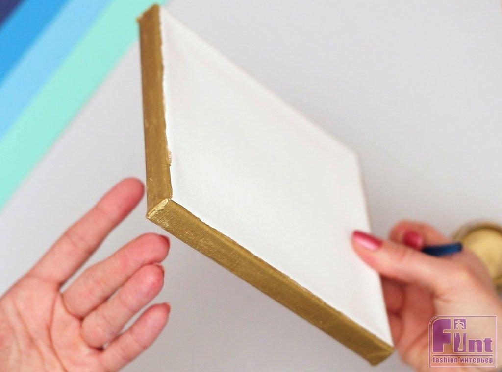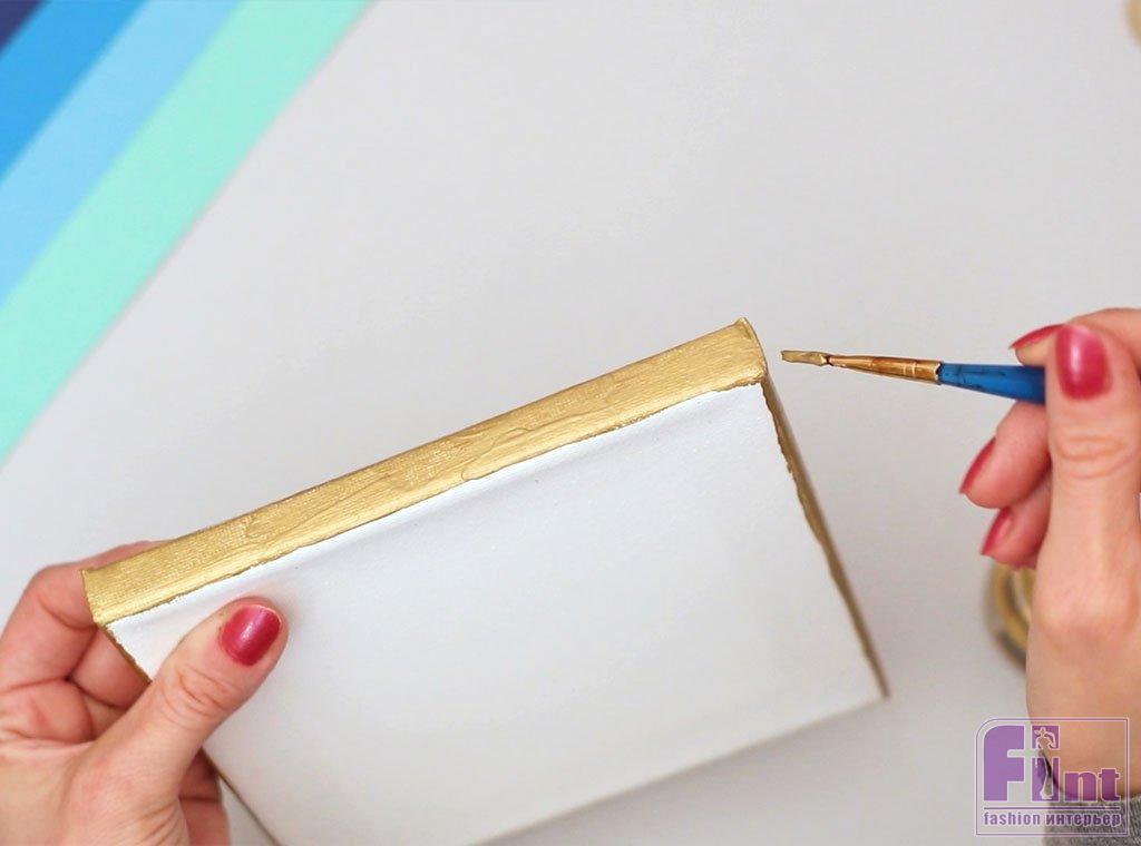 Для начала возьмите холст на подрамнике, кисть и золотую акриловую краску. Переверните холст ребром и нанесите золотую акриловую краску на боковые поверхности холста на подрамнике. Используйте длинные, ровные мазки кистью для наилучшего покрытия и гладкости. Продолжайте обводить холст по всему периметру, закрашивая все края, пока у вас не получится красивое, ровное покрытие золотом на боковой поверхности холста. Оставьте холст до полного высыхания золотой краски, а сами займитесь вырезанием круглых заготовок из бумаги.