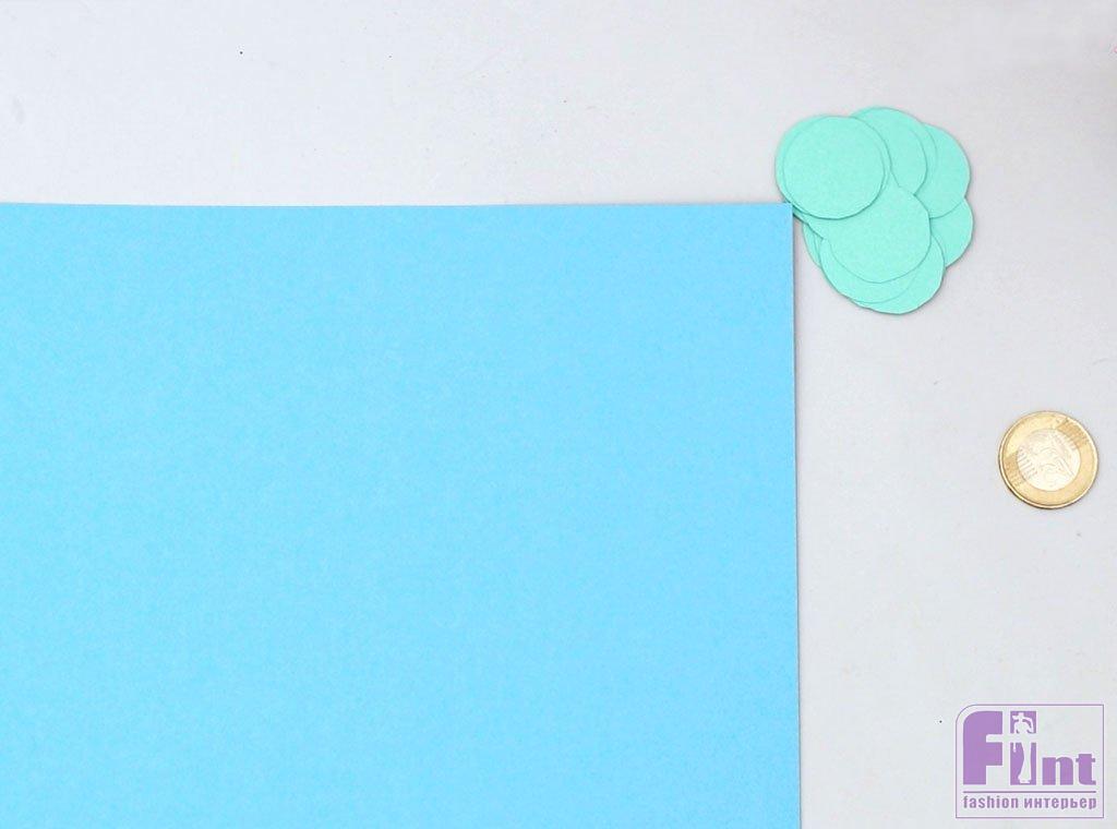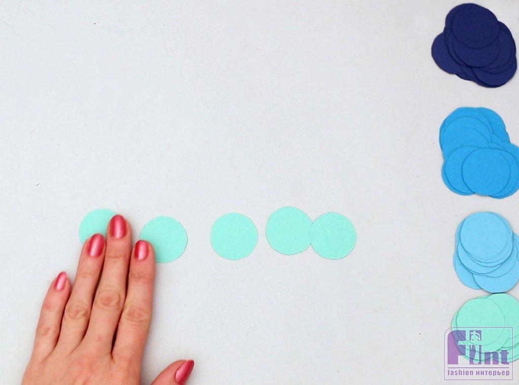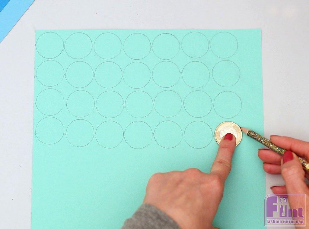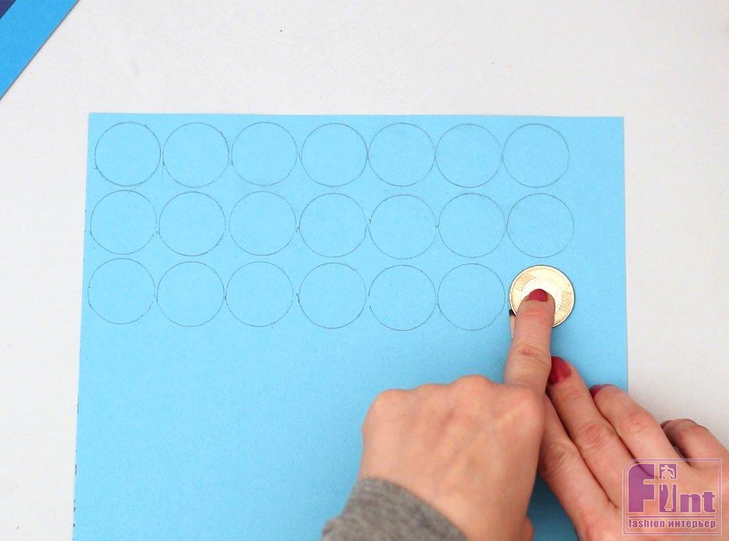 Приступаем к изготовлению чешуи. Для начала возьмите 4 листа бумаги разных оттенков синего цвета, которые красиво сочетаются по тону. Выберите свой первый лист и используйте что-нибудь вроде монеты, которая подойдет вам по размеру, чтобы обвести на листе бумаги столько кругов, сколько поместится на листе.