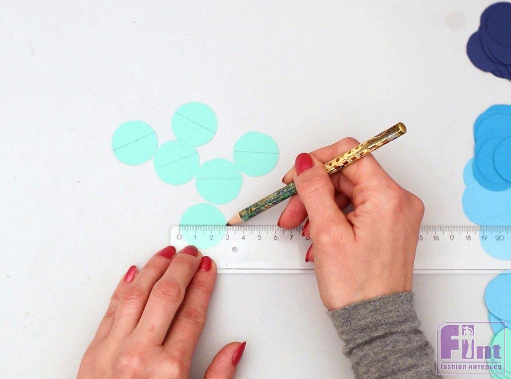 Используйте линейку и карандаш, чтобы провести аккуратную прямую линию прямо по центру ваших заготовок. Линейка – отличный инструмент, который поможет вам провести сделать ровную разметку на цветных бумажных кружочках.
