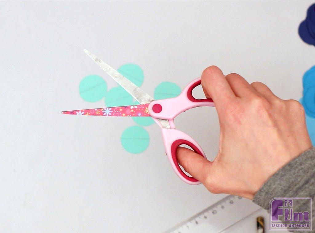 Когда лист бумаги будет заполнен кружочками, вырежьте их все с помощью ножниц. Это трудоёмкий процесс, поскольку вырезать по кругу не очень просто, в отличие от вырезания прямолинейных деталей. Хорошо, если среди ваших инструментов для творчества найдётся специальное приспособление для фигурной вырубки из бумаги. Такие «дыроколы» для скрапбукинга можно купить совсем недорого.