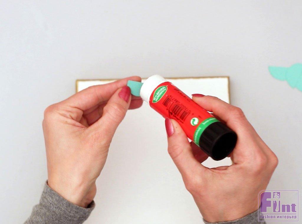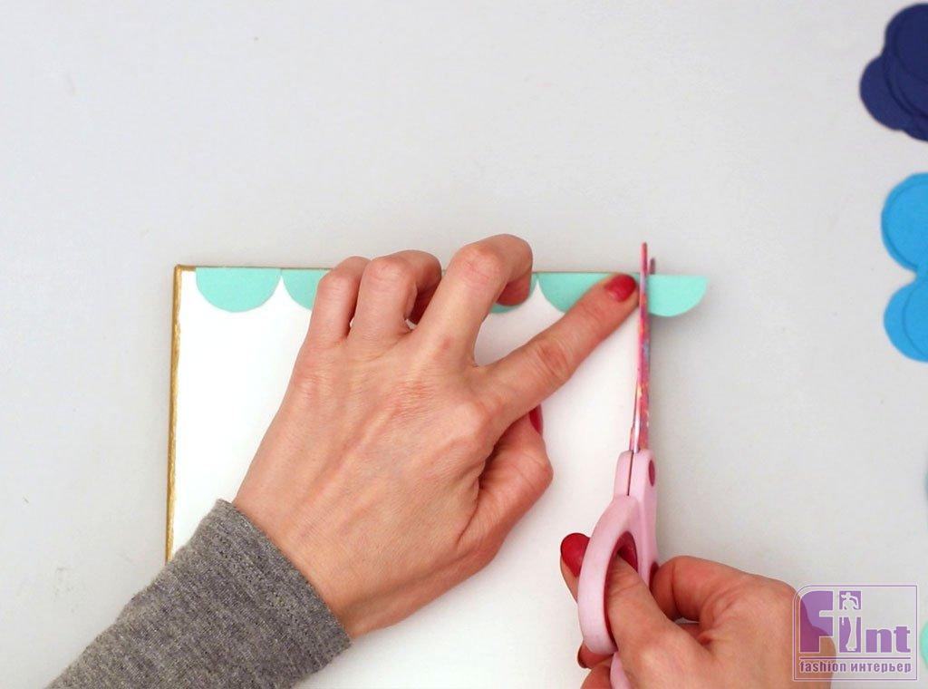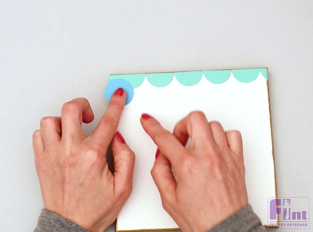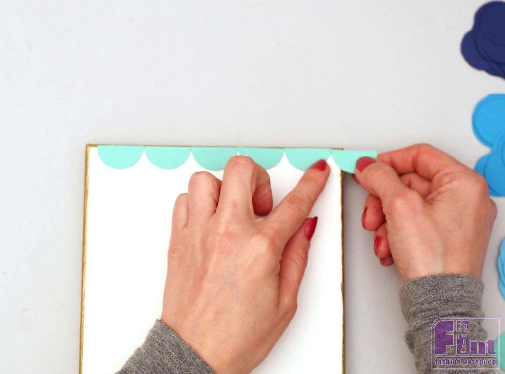 Используя клеевой карандаш, начните приклеивать вырезанные полукруги вдоль верхнего края холста, придерживая плоский край полукруга, чтобы выровнять их по краю рамы. Начните с центра, чтобы все выровнялось, а когда дойдете до края, вы можете обрезать всё лишнее, сохраняя при этом симметричность рисунка.