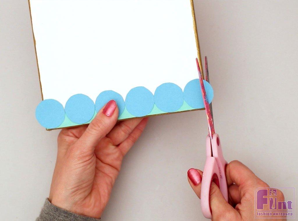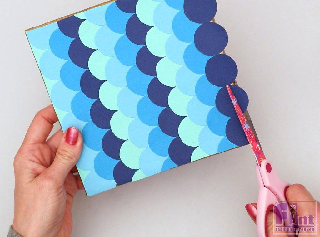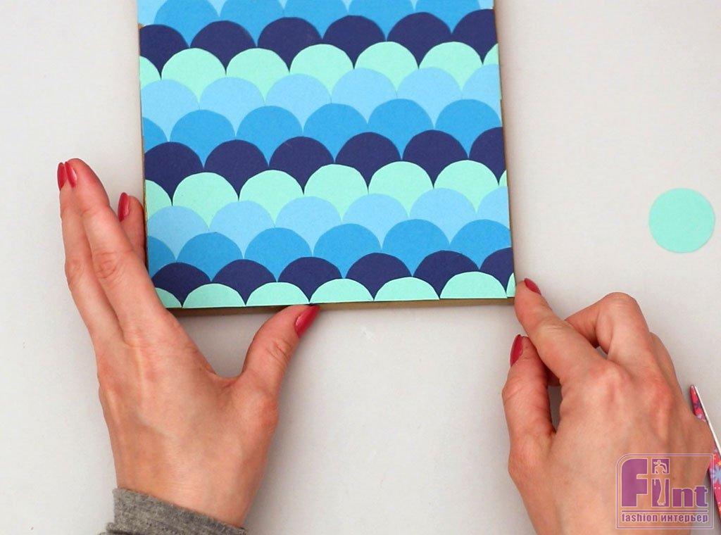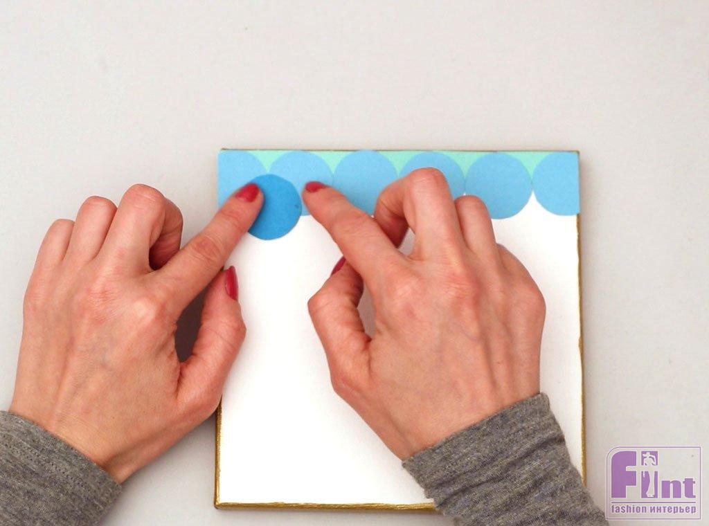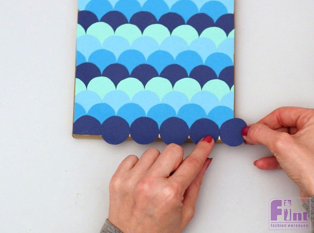 Используя следующий выбранный вами синий цвет, соберите стопку кружочков. Начните раскладывать их в ряд по холсту, перекрывая полукруги, чтобы они закрывали промежутки между первым рядом, словно укладываете кирпичи. Крайние круги вновь обрезайте при помощи ножниц. Обрезайте излишки так, чтобы чешуйки заканчивались на одной линии с краями рамы холста.