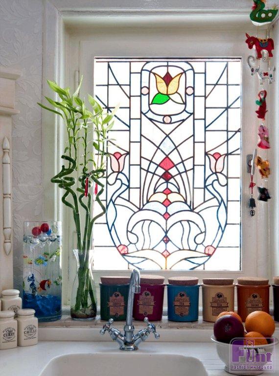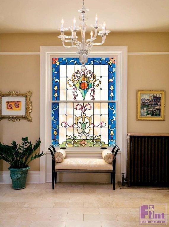 Витражное остекление выглядит невероятно красиво и создаёт дома волшебную атмосферу. Особенно в комнатах на солнечной стороне: утром и днём лучи будут проходить через цветные стекла, а на полу и на стенах появятся разноцветные блики. Но нужно учесть, что витражи не особенно защищают от яркого света, поэтому лучше сделать их на кухне, в гостиной или в той комнате, где вы не спите, если для вас важно полное затемнение. Также это хорошее решение для ванной с окном или лестничных проёмов в загородном доме.