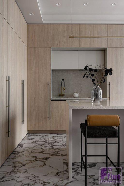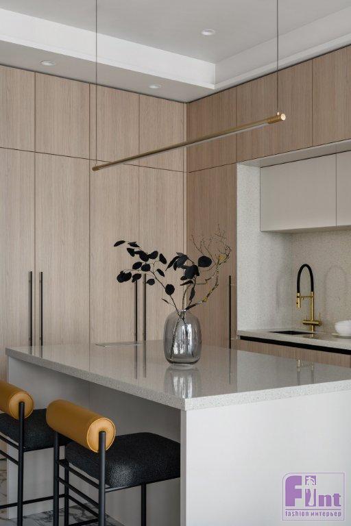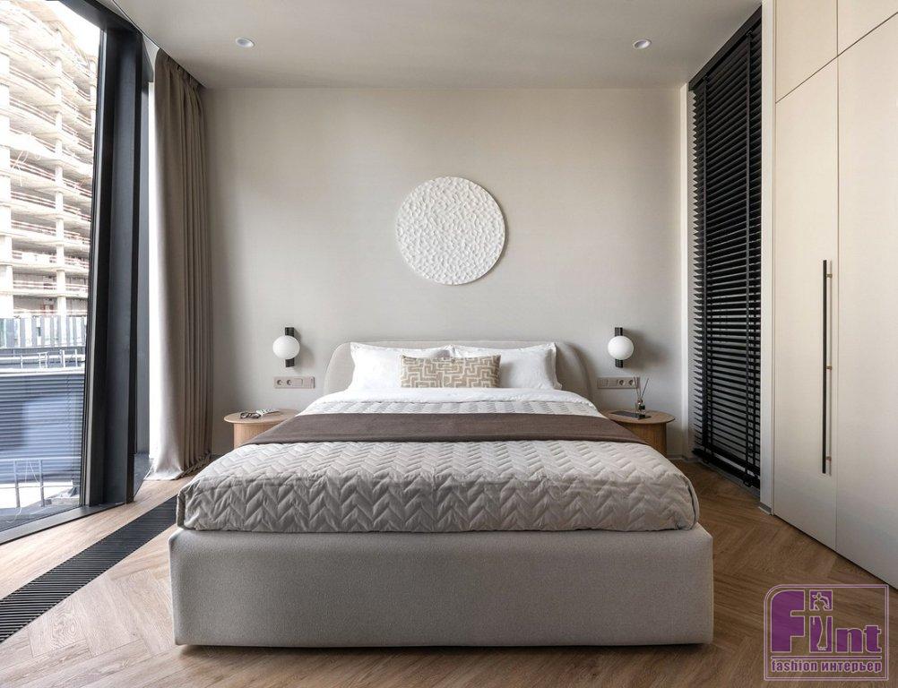 Жилью в современной новостройке априори подходил современный интерьерный стиль. Особенность квартиры — панорамные окна в пол от застройщика в духе хай-тек — придавала помещениям эффектный, но ярко техногенный акцент, входящий в противоречие с представлением заказчицы о домашнем уюте. Чтобы нивелировать впечатление от огромных стеклянных полотен в толстом алюминиевом профиле, да ещё и расположенных с небольшим уклоном относительно вертикалей стен, дизайнеры обратились к тёплым природным оттенкам.