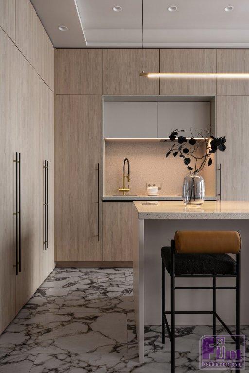 Оптимальной конструкцией для хранения стал блок из перегородок и встроенных шкафов, визуально спрятанный в недрах санузла. Со стороны спальни в нём находится гардероб, со стороны санузла — стиральная машина и шкафы. В стене, обращённой к кухне, предусмотрен открытый стеллаж заподлицо со стеной. Кухня максимально замаскирована под жилое помещение, что визуально облегчает пространство. Духовка и микроволновая печь встроены в кухонный остров с тыльной стороны. Смеситель и варочная панель помещены в нишу. Холодильник и вытяжка скрыты за глухими фасадами шкафов.