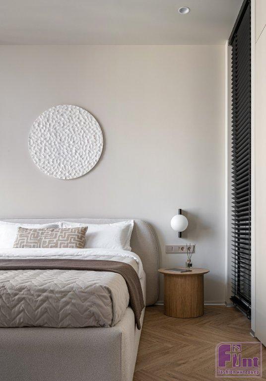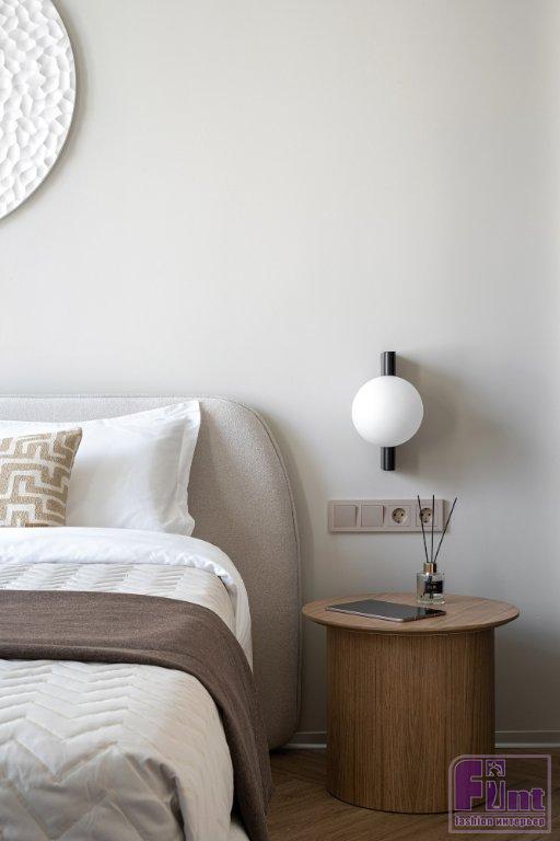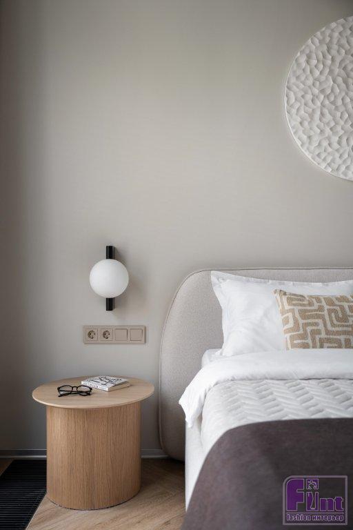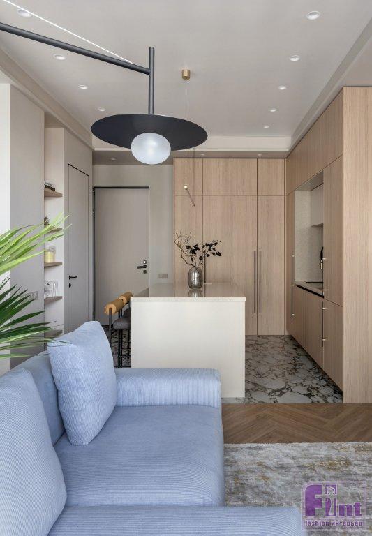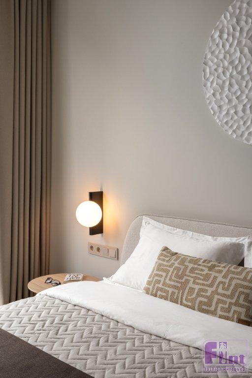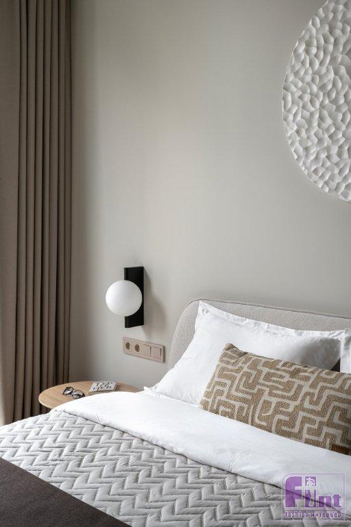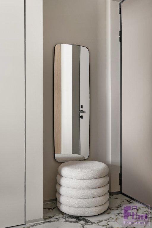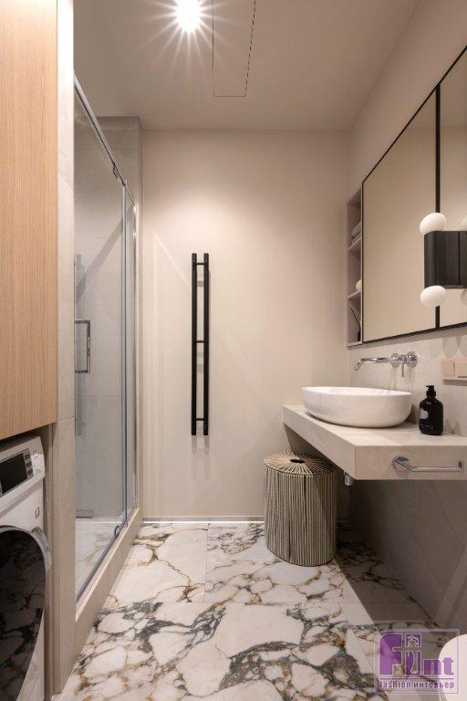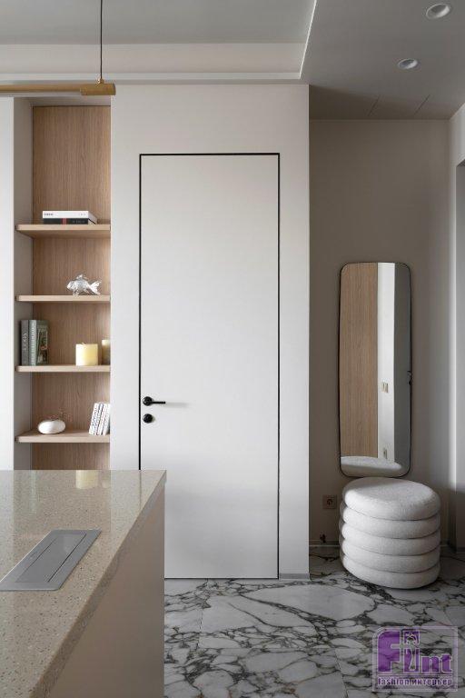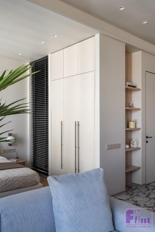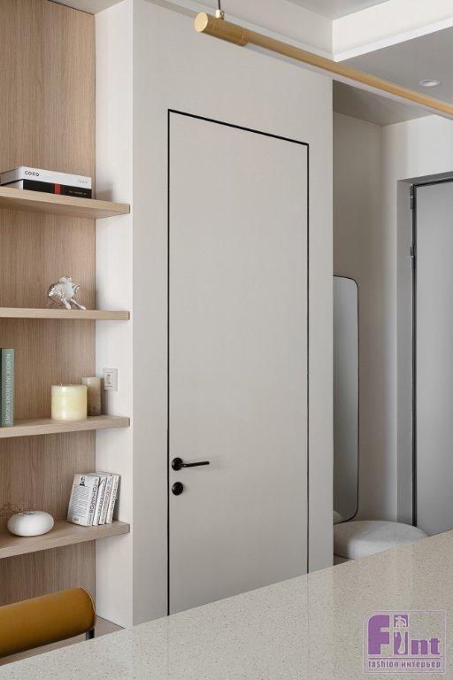 Статус апартаментов с более лояльными требованиями к перепланировкам, чем в квартирах, позволил кардинально преобразить пространство, при этом все мокрые зоны остались на своих местах. Зоны гостиной и спальни расположили близ панорамного остекления. Кухня — слева от входа, санузел соответственно справа, как было у застройщика. В санузел ведёт дверь скрытого монтажа, дверная коробка встроена в проём. Полотно двери покрашено в цвет стен и визуально не акцентирует на себе внимание — выигрышное решение для небольших пространств.