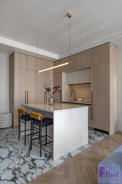 Имеющиеся межкомнатные перегородки были снесены. Новые перегородки построены из пазогребневых блоков. Качество стяжки вполне устраивало, и она послужила основанием для напольных покрытий. Сложности возникли со встроенной системой вентиляции и кондиционирования. В результате перепланировки проложенные застройщиком канальные системы требовали переустройства, но с использованием уже установленного оборудования. Два кондиционера и вентиляционная установка на отведенных им местах серьезно понижали высоту потолка. В результате доработки инженерной части всё же получилось разместить оборудование таким образом, что в зоне кухни и гостиной высота потолка осталась максимальной. В санузле и спальне требуемый опуск потолка даже улучшил пропорции небольших помещений.