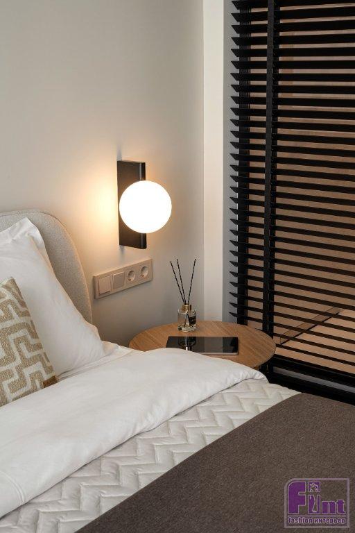 За тёмными жалюзи в спальне находится стеклянная стена душевой. Редкий и нестандартный приём позволил визуально расширить границы обоих помещений, создать эффект тропиков, обеспечить санузел естественным освещением. На стадии проекта расположение душевой кабины тщательно продумали и промерили, чтобы унитаз оказался вне зоны видимости из спальни. Прозрачную панель из безопасного закаленного стекла в раме из алюминиевого профиля заказали у производителя современных оконных систем. Ламели можно отрегулировать так, что дневной свет будет проходить в душевную зону, но не будет видно, что происходит там внутри.