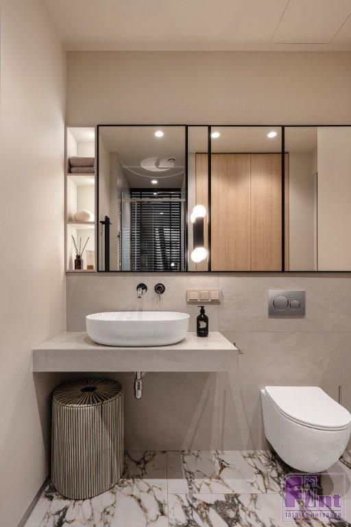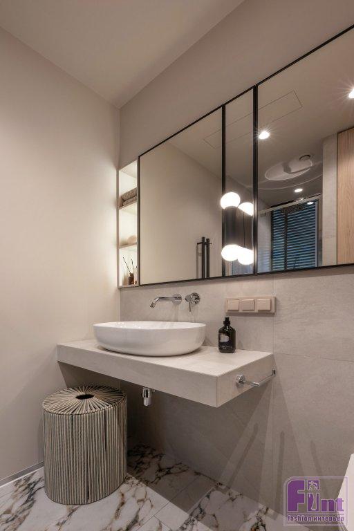Навесные шкафы с зеркальными дверцами в санузле установлены точно в размер глубины ниши над коробом, скрывающим инсталляцию унитаза, подводку труб к смесителю и раковине, а также электрическую разводку. Горизонтальное зеркало по всей длине стены отлично увеличивает визуальный объем помещения.