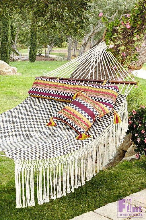 Из крупного узкого ковра несложно сделать прочный и комфортный гамак для дачного участка или квартиры. В городском жилье его можно повесить в гостиной, детской, на балконе. Изделие должно быть с плотным плетением и надежной основой, которая выдержит вес человека. Закрепите ковёр с помощью канатов или карабинов, равномерно распределяя нагрузку по краям. Для большего комфорта можно положить внутрь плоские подушки или небольшой матрас.