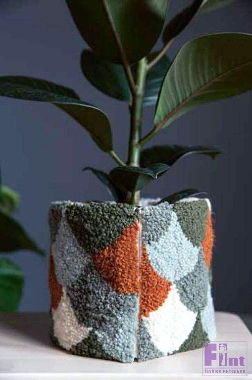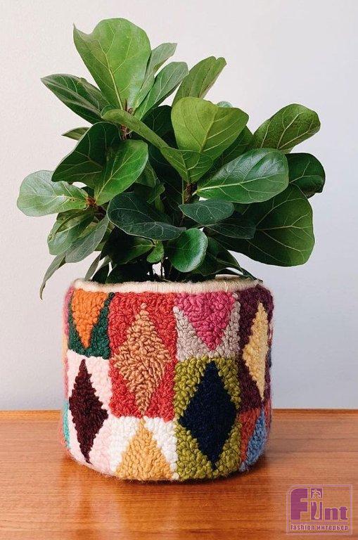 Из тонкого безворсового ковра получится стильный и практичный чехол для цветочного кашпо. Плотная структура материала защитит горшок от повреждений, скроет сколы, царапины и другие возможные дефекты. Сделать такое украшение своими руками просто: отрежьте нужное количество материала, придайте форму, закрепите с помощью клея для ткани, шнуровки или декоративных кнопок. Помните, что натуральные материалы чувствительны к влаге, поэтому поливать растение нужно будет аккуратно. Текстильные чехлы для кашпо особенно хорошо смотрятся в стилях интерьера: бохо, эко и сканди.