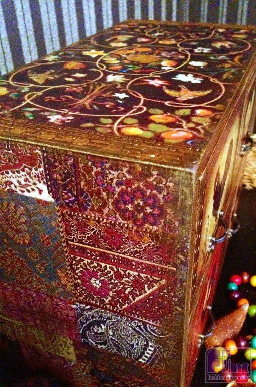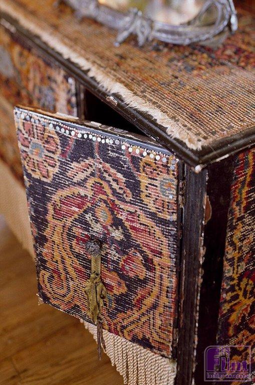 Неочевидная, но очень красивая идея — использовать ковёр для обновления мебели. Таким способом можно украсить комод, прикроватные тумбы, фасады шкафов. Всё, что нужно, — закрепить материал на поверхности с помощью клея, мебельного степлера или декоративных гвоздей. Если обшиваете предмет целиком, следите за совмещением узора. Для большей износостойкости обработайте края ткани декоративными шнурами, нитками или тесьмой. Такой декор лучше всего подойдёт для интерьеров в стиле бохо, лофт или эклектика.