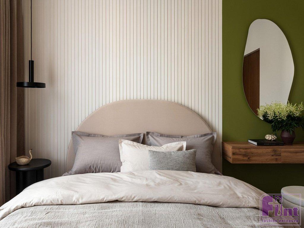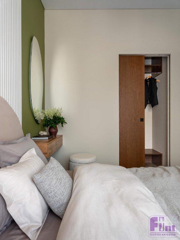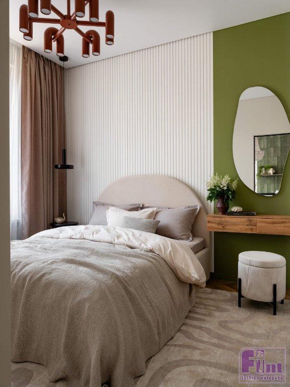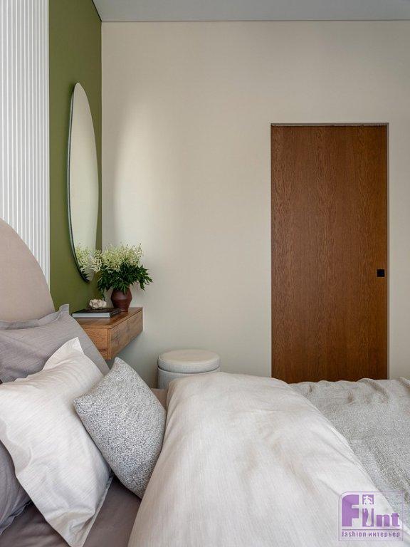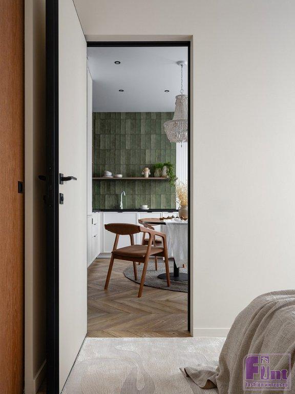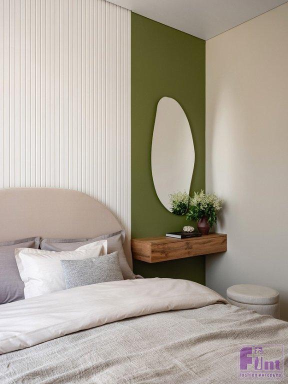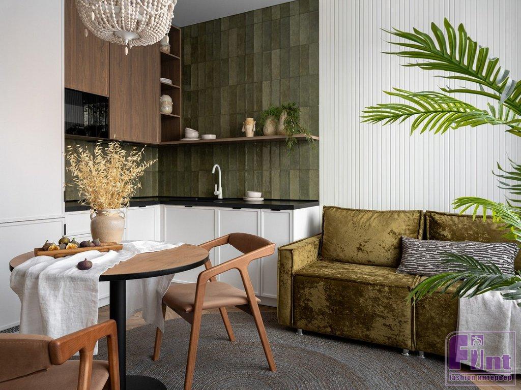 Цветовая палитра проекта построена на нейтральных бежевых и кремовых оттенках и дополнена акцентами: разными вариантами зелёного и серо-голубого, выразительными тёмными фактурами мебельных фасадов. Кухня-гостиная оформлена в зелёных тонах, что символизирует связь с природой и обеспечивает спокойную, домашнюю атмосферу. Глубокие травяные и оливковые оттенки в сочетании с цветом натуральной древесины и кремовой основой подчёркивают минималистичность оформления.