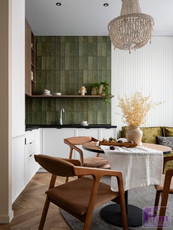 Каждый сантиметр площади квартиры продуман таким образом, чтобы создать эффект воздушности и лёгкости. В качестве декора используется целый ансамбль из керамики, деревянных элементов и живых растений. Каждое изделие было тщательно выбрано, чтобы подчеркнуть гармонию, в которой предметы не просто украшают, но и наполняют атмосферу теплом и спокойствием — что полностью соответствует концепции стиля джапанди. Люстра ручной работы из деревянных бусин имеет форму классической модели, которую привычнее видеть в хрустальном исполнении. Это необычное сочетание характерно для концепции стиля джапанди, и придает интерьеру нарядный, но не пафосный вид.