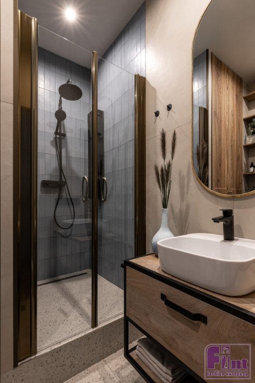 Квартира сдавалась без отделки, поэтому был выполнен весь комплекс работ. Радиаторы и окна от застройщика решили не менять. Для напольного покрытия выбрали практичные в эксплуатации керамогранит и кварцвинил, уложив их на новую стяжку. Перегородки возводили из пеноблоков, затем их оштукатурили и покрасили. Акцентные зоны выделили декоративными рельефными панелями. В санузле для отделки использовали керамогранит. Потолок сделали натяжной с теневым примыканием, опустив его на 10 см по всей площади квартиры.