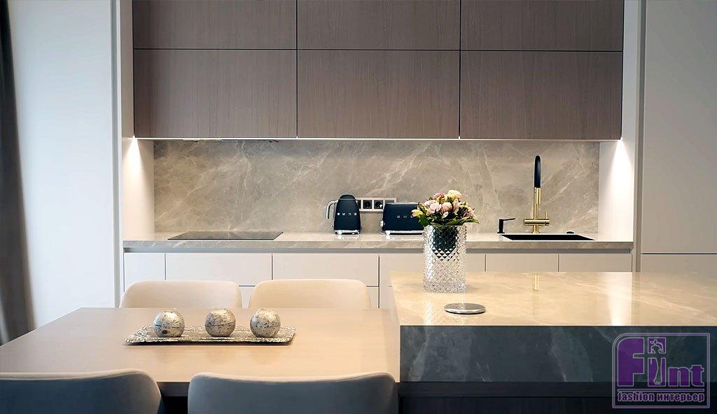 В квартире Марии Кожевниковой основная площадь отдана под просторную кухню-гостиную. Особый акцент Мария сделала на зоне кухне, где обожает проводить много времени. Сам гарнитур выполнен в бежевых и кофейных оттенках без каких-либо вычурных элементов, но с уникальной автоматической системой открывания створок. Расстановку мебели девушка продумывала самостоятельно, учитывая все нюансы. В зоне кухни для Марии важен комфорт и удобство.