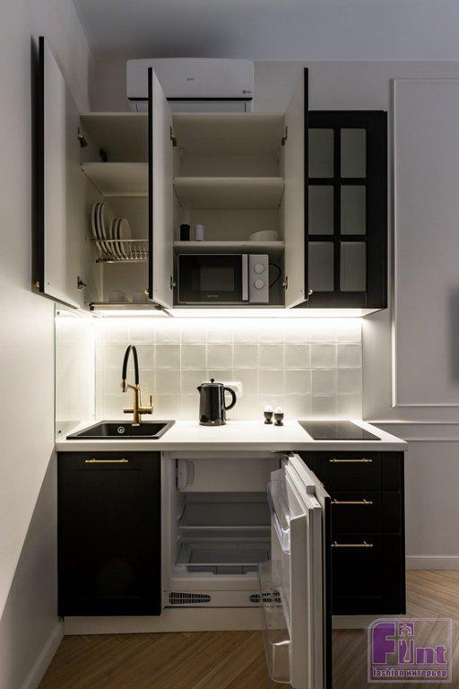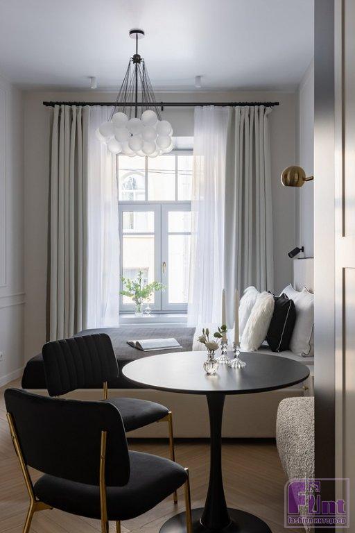 Эти апартаменты приобрели с инвестиционной целью. Они находятся в одном из центральных районов Санкт-Петербурга, в Доходном доме Г. Ф. Киселева 1907 года, который отреставрировали в 2023 году. Перед дизайнером, основателем и руководителем студии дизайна SHEYN DESIGN Екатериной Шейн стояла задача сделать пространство привлекательным для туристов. Было важно расположить спальное место на двоих, предусмотреть системы хранения, оборудованную кухню.
