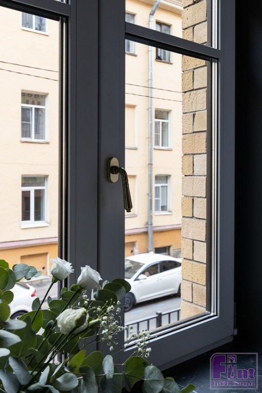 Откосы окна дизайнер предложила окрасить в чёрный цвет, а подоконник оформить керамогранитом под чёрный камень. «Я хотела, чтобы каждый уголок этой маленькой квартиры выглядел роскошно, — объяснила решение Екатерина. — Получилась уютная зона, куда можно присесть и полюбоваться улочкой Петербурга. Также я заменила обычную белую ручку окна на латунную».