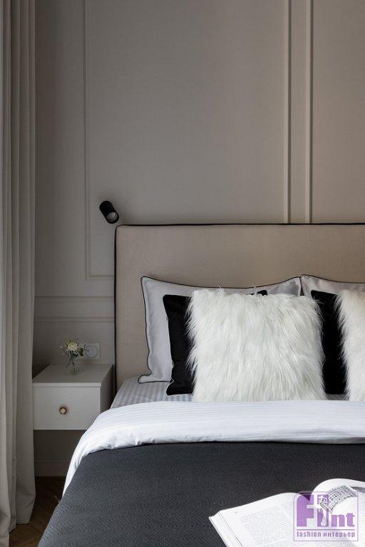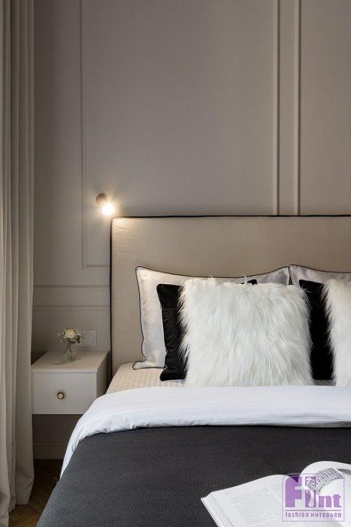 В отделке стен использовали светлую моющуюся краску. В зоне сна и рядом с обеденным столом решили украсить стены молдингами, зонируя пространство такой отделкой. На полу уложили светлый ламинат «ёлочкой» под дерево. В прихожей использовали чёрно-белую плитку на полу. Такую же уложили на полу в ванной комнате.