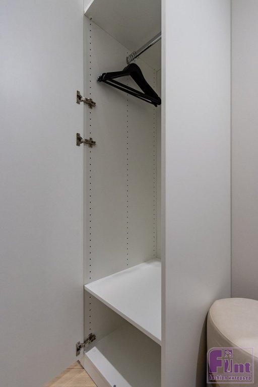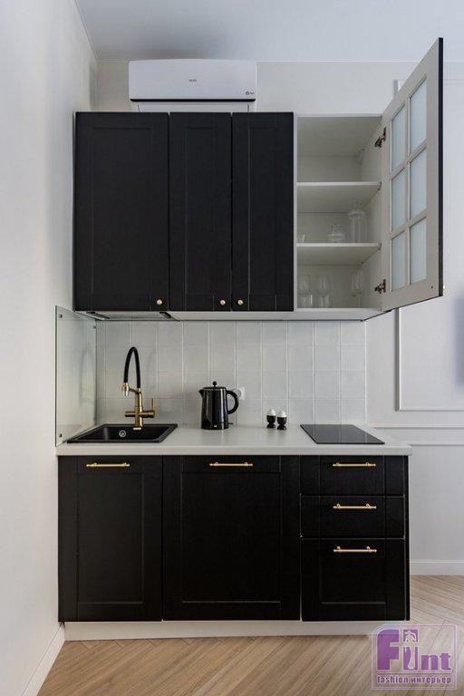 В прихожей установили шкаф на три створки, где есть секция для хранения одежды на плечиках, полки и пространство для хозяйственных вещей: сушилки, гладильной доски, утюга. Это шкаф, купленный в мебельном магазине, его не делали на заказ. В торце шкафа со стороны кушетки установили стеллаж для хранения книг и декора. Он — заказной. Также в прихожей была антресоль, её закрыли дверками в цвет стен. Кухня тоже собрана из готовых модулей. Фасады — тёмные в поддержку других тёмных акцентов в интерьере. В нижние базы встроен холодильник. В одном из верхних спрятана микроволновая печь. На столешнице — мойка и варочная поверхность на две конфорки для экономии рабочего пространства. Кровать подобрали с подъёмным механизмом, это тоже дополнительное место для хранения. Две тумбочки у кровати — для полезных мелочей.