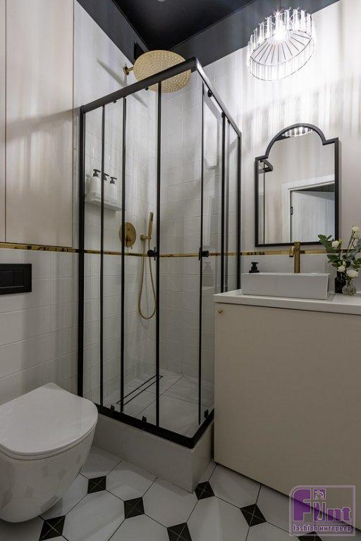 Стены в ванной отделаны белой квадратной плиткой и светлой краской. Граница плитки и краски очерчена латунным профилем. Профиль продолжили и в зоне душа, которая полностью выложена плиткой. Потолок в ванной сделали чёрным (потолки везде натяжные, в ванной тоже), не побоялись того, что это визуально занизит их высоту. Дело в том, что в студии потолки достаточно высокие, 3 метра, но в маленькой ванной такая высота губительна, поскольку создаёт эффект колодца.