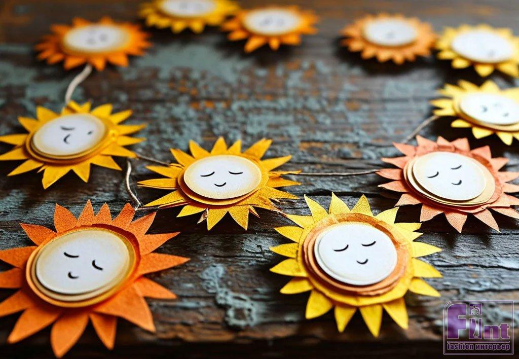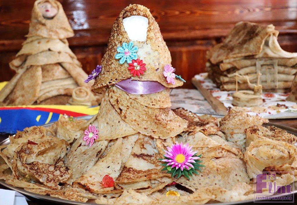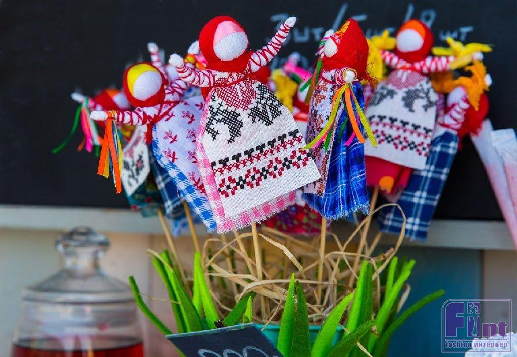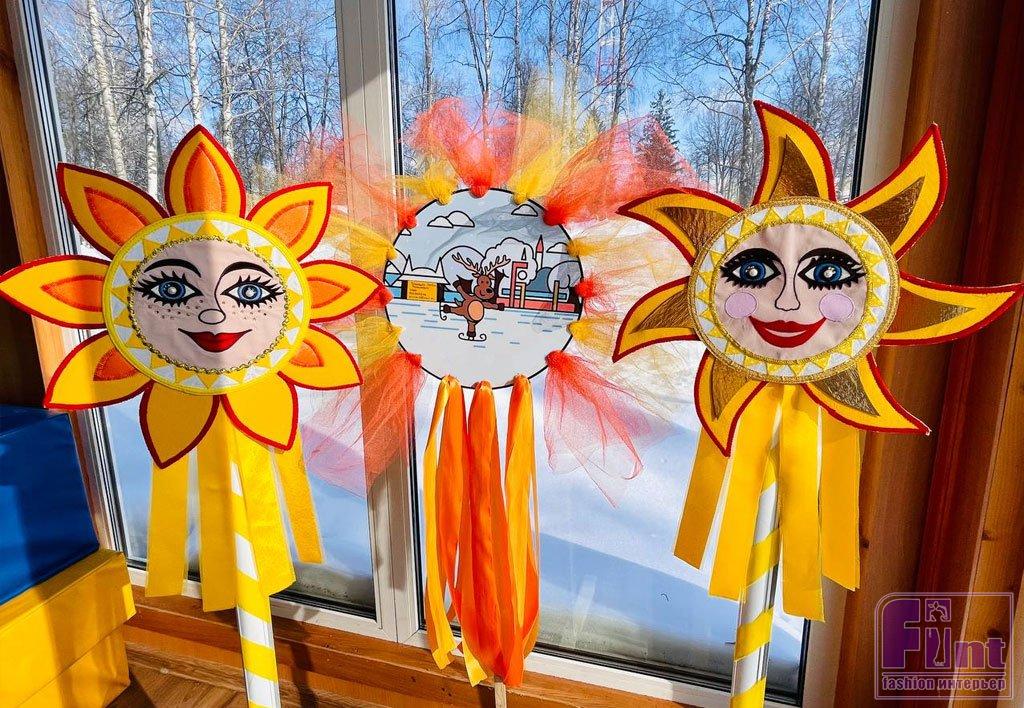 Традиционный символ Масленицы — чучело. Делают его из соломы, ткани и других подручных материалов. Оно станет центральным элементом праздничного декора. Не стоит забывать и о других символах праздника — солнце и блинах. Можно подобрать текстиль с тематическими рисунками, использовать наклейки, сделать витражи и подвески.
