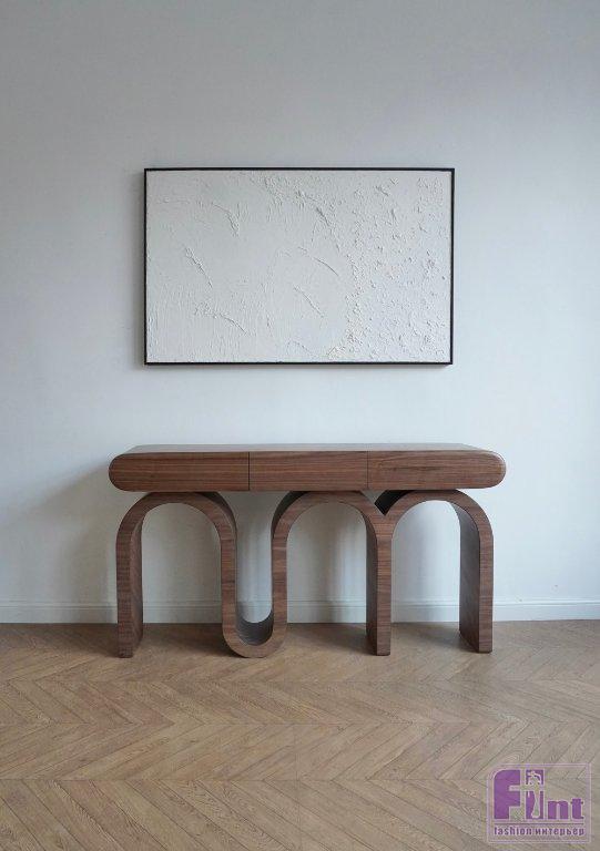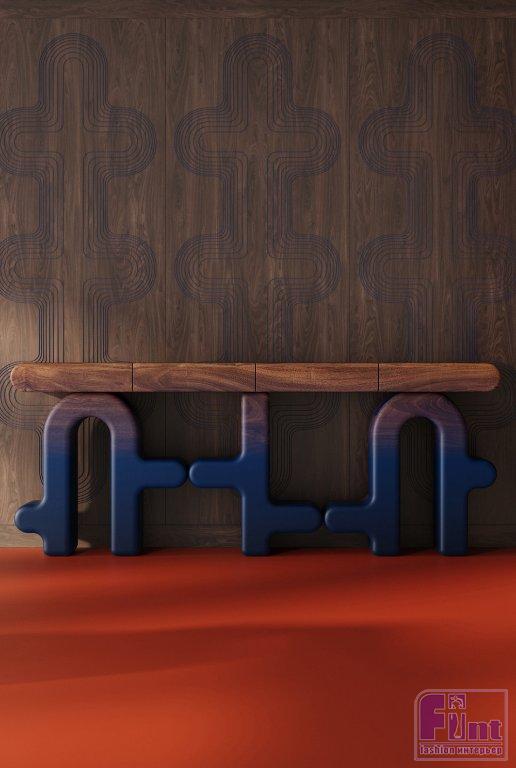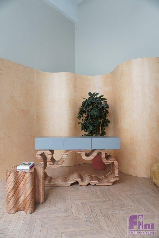 Помимо коллекционных предметов студия разрабатывает и серийную мебель, а также стеновые панели из шпона или в эмали. Серийная мебель насчитывает уже более 150 моделей и ежегодно пополняется на 10-20 новых позиций: акцентные предметы-скульптуры представляют собой цельные конструкции, покрытые натуральным шпоном различных пород дерева. Настолько высокий уровень работы с этим материалом не показывает ни одна другая студия в нашей стране — для создания устойчивого покрытия со сложной геометрией команда в течение нескольких лет разрабатывала уникальную технологию, которую теперь использует для производства самобытных предметов.