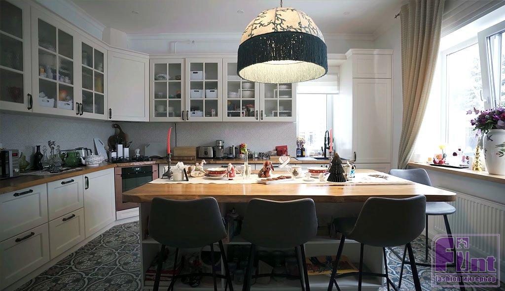Кухня в загородном доме Эвелины Блёданс – одно из самых удачных решений в интерьере жилья. Хозяйкой все продумано до мелочей. Такой системе организации хранения позавидуют даже профессиональные организаторы пространства. Несмотря на то, что дом покупался уже готовый, Эвелина создавала свой уникальный интерьер самостоятельно, наполняя его с душой и постепенно. Например, в кухне от старого ремонта осталась только батарея, но и она скоро будет заменена оригинальной чугунной моделью, выполненной под старину. Полностью белый кухонный гарнитур создаёт ощущение простора и лёгкости, но главным акцентом стал яркий восточный узор на полу. А особой гордостью хозяйки является столешница из карагача – натурального дерева с выразительной текстурой.