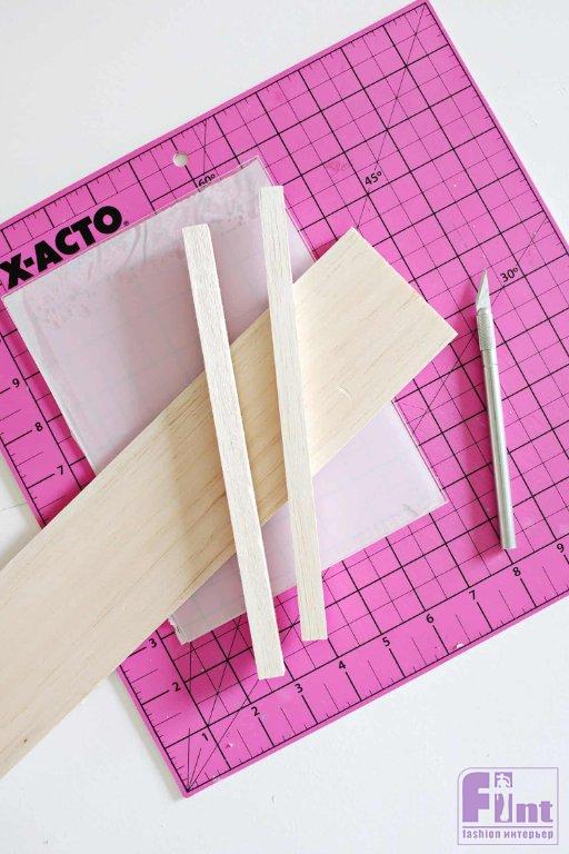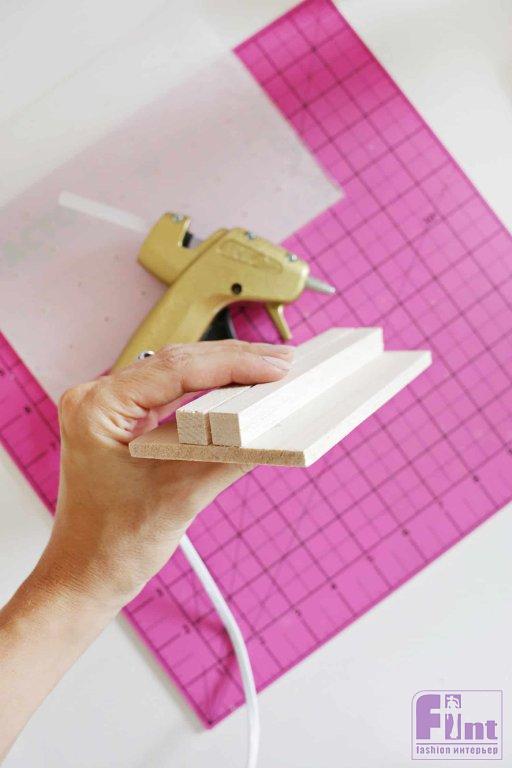 Приклейте горячим клеем квадратные палочки посередине доски, оставив достаточно места, чтобы между ними можно было вставить акриловую деталь.
