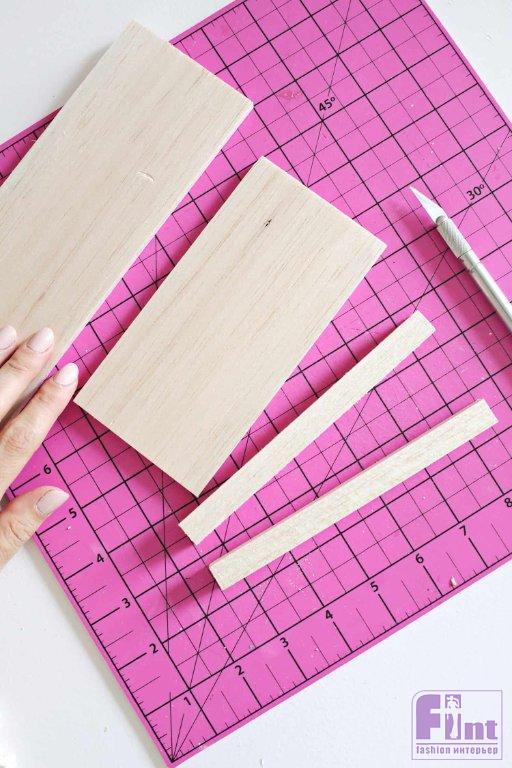 Используя ножовку по дереву, отпилите от вашей доски прямоугольник размером 7 × 15 сантиметров и две квадратные палочки длиной 15 сантиметров.