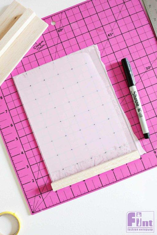 Положите акриловый прямоугольник на коврик для резки так, чтобы вы могли видеть линии разметки, и отметьте точки по вертикали и горизонтали с интервалом в 2,5 см, чтобы получилась сетка из равномерно расположенных точек. У вас получится 5 точек в ряд и 7 рядов.