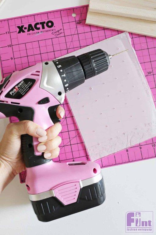 Используйте электрическую дрель и сверло нужного диаметра, чтобы просверлить каждое из отмеченных отверстий. Всего нужно проделать 35 отверстий. Диаметр отверстий зависит от ваших серёжек. Если вы планируете хранить на держателе серёжки с застёжкой в виде крючка, отверстия должны быть чуть большего диаметра, нежели для серёжек-гвоздиков. После сверления снимите с акрила защитные плёнки.