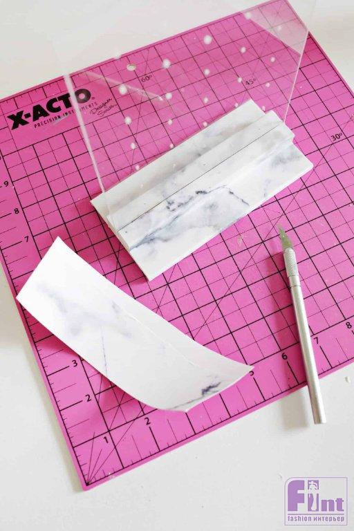 Покрасьте деревянные поверхности по бокам белой краской, а затем оклейте деревянную основу клеевой плёнкой с мраморным узором. Если плёнку с клеевой основой вам будет сложно найти, используйте обычную бумагу с аналогичным мраморным узором и обычный клей ПВА.