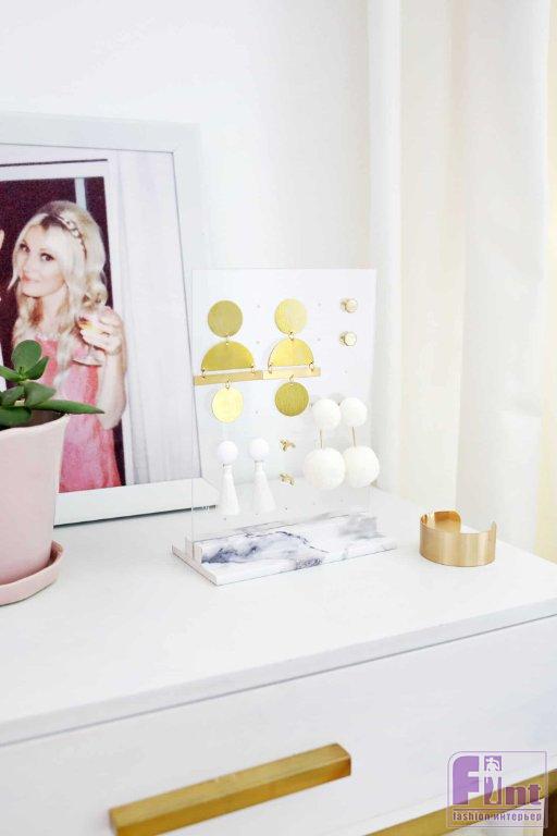 Этот органайзер, сделанный из прозрачного акрила, отлично подходит для всевозможных серёжек-гвоздиков, но и обычные серёжки с застёжкой в виде крючка также можно на нём хранить, если сделать отверстия чуть большего диаметра. Благодаря своей прозрачной основе этот держатель для серёжек выглядит невесомым и воздушным и очень стильно смотрится на туалетном столике!