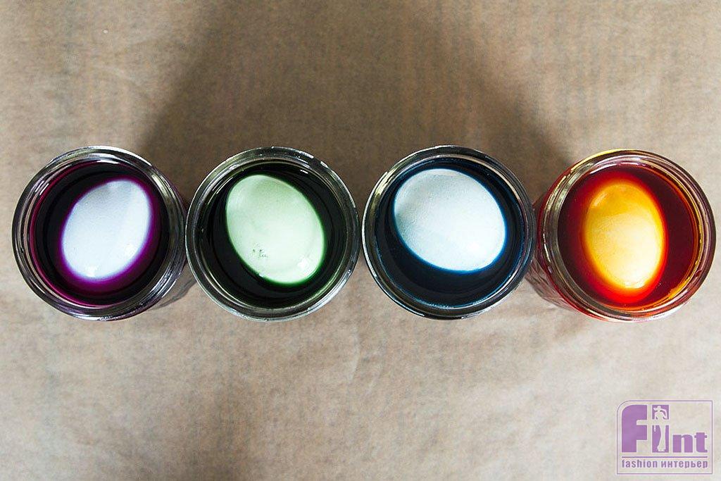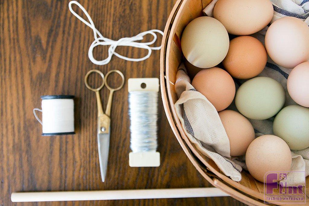 Начните с окрашивания яиц. Мы использовали набор натуральных красителей для яиц и сохранили некоторым яйцам их естественный коричневый цвет. Предварительно удалите белок и желток из яиц. Для этого с помощью булавки проделайте небольшие отверстия в верхней и нижней части яйца. Подуйте через верхнее отверстие, и содержимое выйдет из нижней части. Затем действуйте по инструкции к вашим красителям.