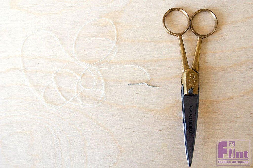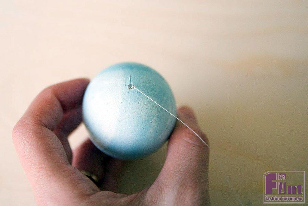 Повернув проволочную «планку», проденьте её вместе с привязанной ниткой в верхнее отверстие яйца. Опустите её, а затем потяните за нитку. Теперь проволока будет работать внутри яйца как надёжная застежка.
