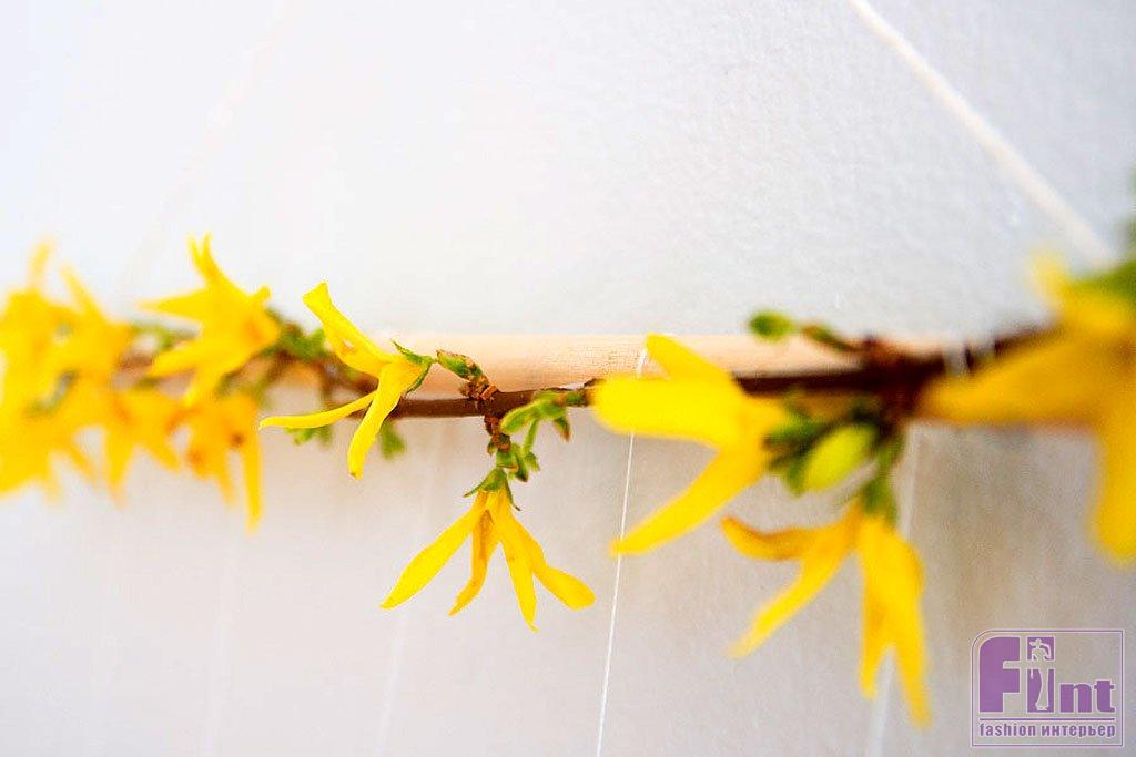 Осталось украсить вашу деревянную палочку яркой искусственной веточкой с цветами, и ваша замечательная пасхальная подвеска из яиц готова! Веточку можно закрепить на палочке с помощью швейных ниток или воспользоваться клеевым пистолетом для горячего клея.