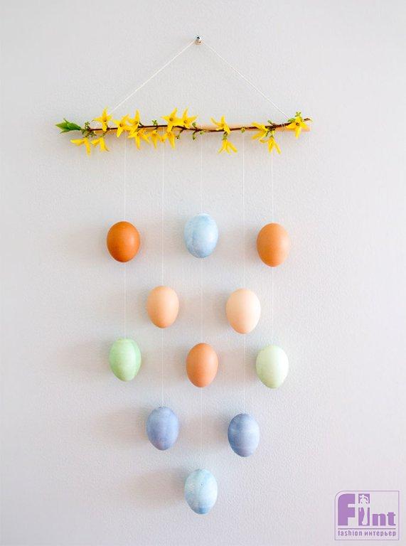 Подбирайте яйца для крепления в гирлянды по цвету. Создайте из крашеных яиц и яиц с натуральным цветом красивое панно, чередуя цвета и располагая яйца рядами. Мы сделали простую схему из пяти рядов. Нижний ряд состоит всего из одного яичка, следующий ряд включает два яйца, третий ряд – три. Четвёртый ряд вновь состоит из двух яиц, и самый верхний, пятый ряд, снова сформирован из трёх яиц.