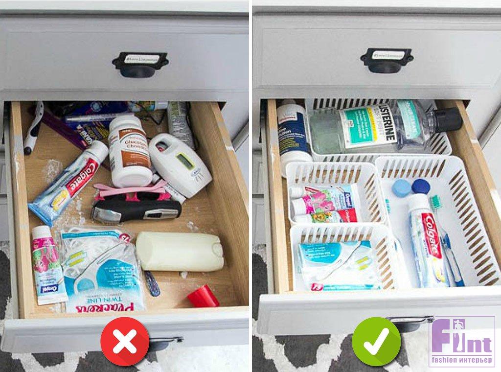 Если складывать вещи любых категорий в пустое пространство ящиков, порядка там можно не ждать. Предметы будут перемешиваться, кататься туда-сюда, теряться. Вместо этого складывайте их сначала в контейнеры и органайзеры и только потом ставьте те в ящики. Это также упростит уборку. Когда возникнет необходимость протереть пыль внутри, гораздо проще вынуть 2-3 контейнера и потом поставить их назад. А вот выгребать все мелочи вы лишний раз не захотите — и грязи станет больше.