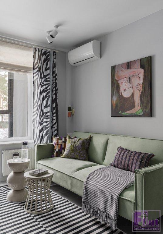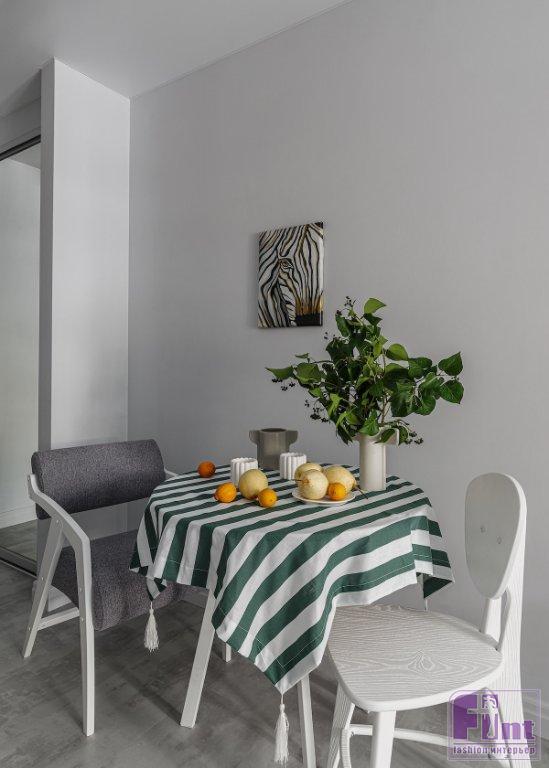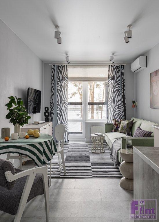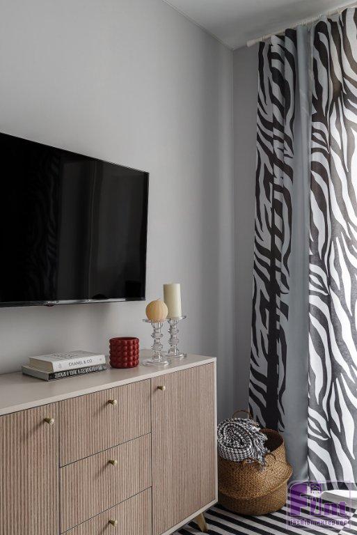 «Основная идея — сделать квартиру яркой и нескучной для кратковременного пребывания. Стены задумывались как фон для декора и текстиля, и тут мы решили поиграть. Принты сочетаются между собой по принципу контраста: яркие линейные на скатерти, декоративных подушках, фартуке, ковре, против анималистичных на шторах и в искусстве. Вот такая игра с принтами сделала пространство ярким. Если такое буйство наскучит, все это можно достаточно просто заменить на более спокойные тона», — рассказывает о своём проекте Мария.